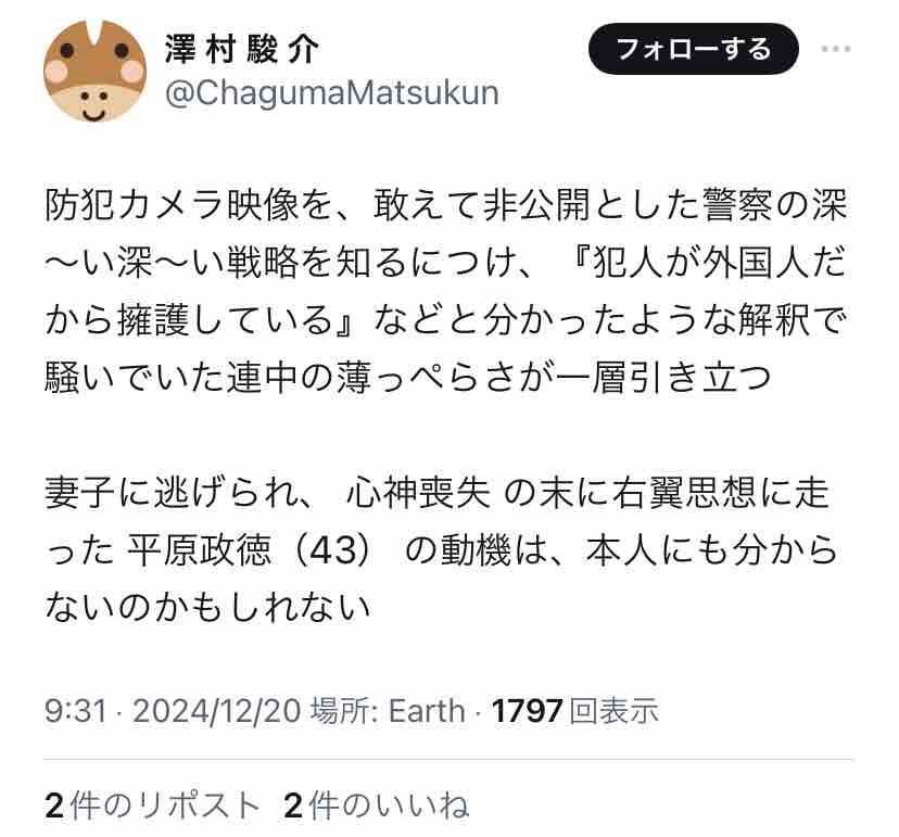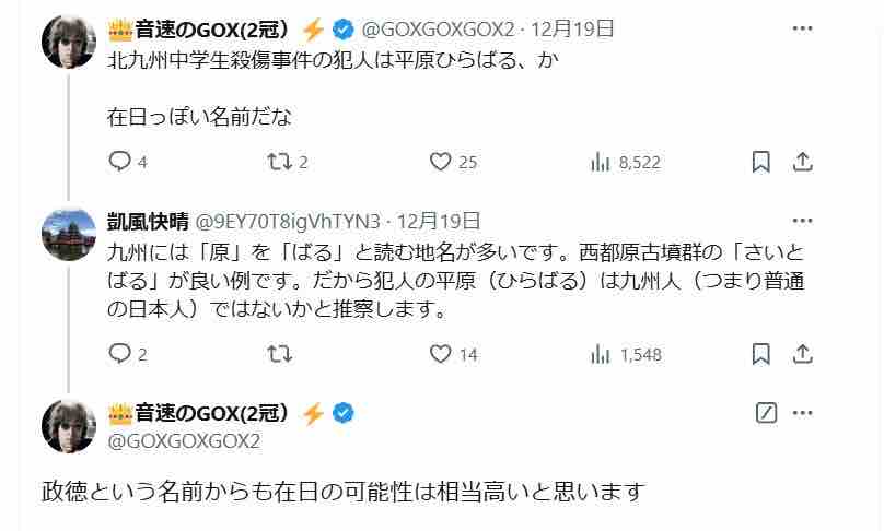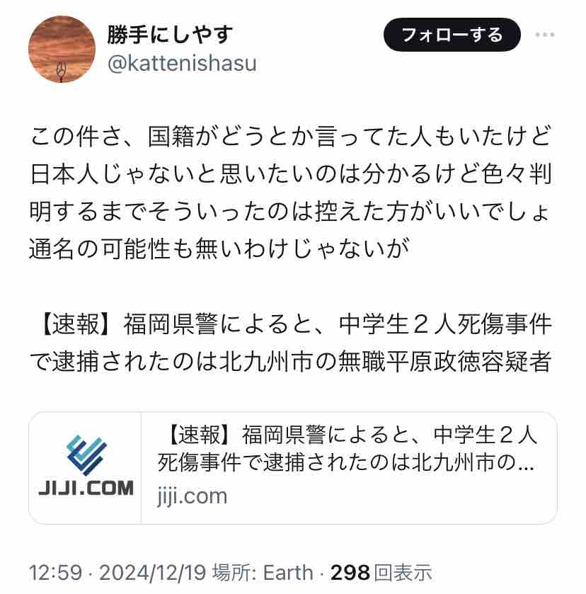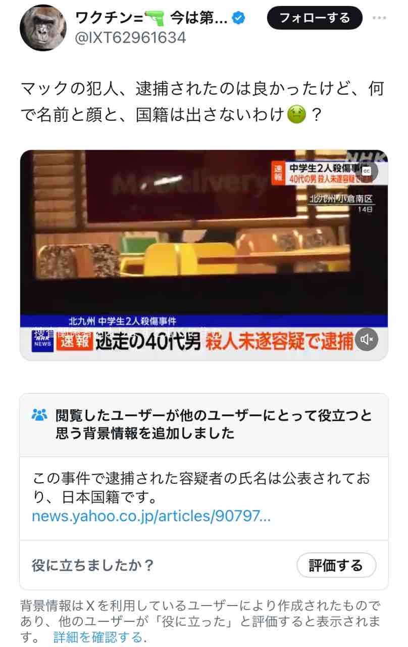 「日本国籍だとは報道されてないんだから、もしかしたら在日外国人かもしれない。と言うかきっとそうだ」