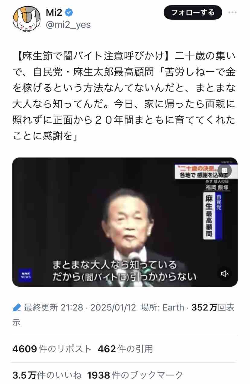 『【悲報】麻生太郎「まともなら闇バイトなんて引っかからない、”苦労しないで稼げる方法”なんかないんだよ」』