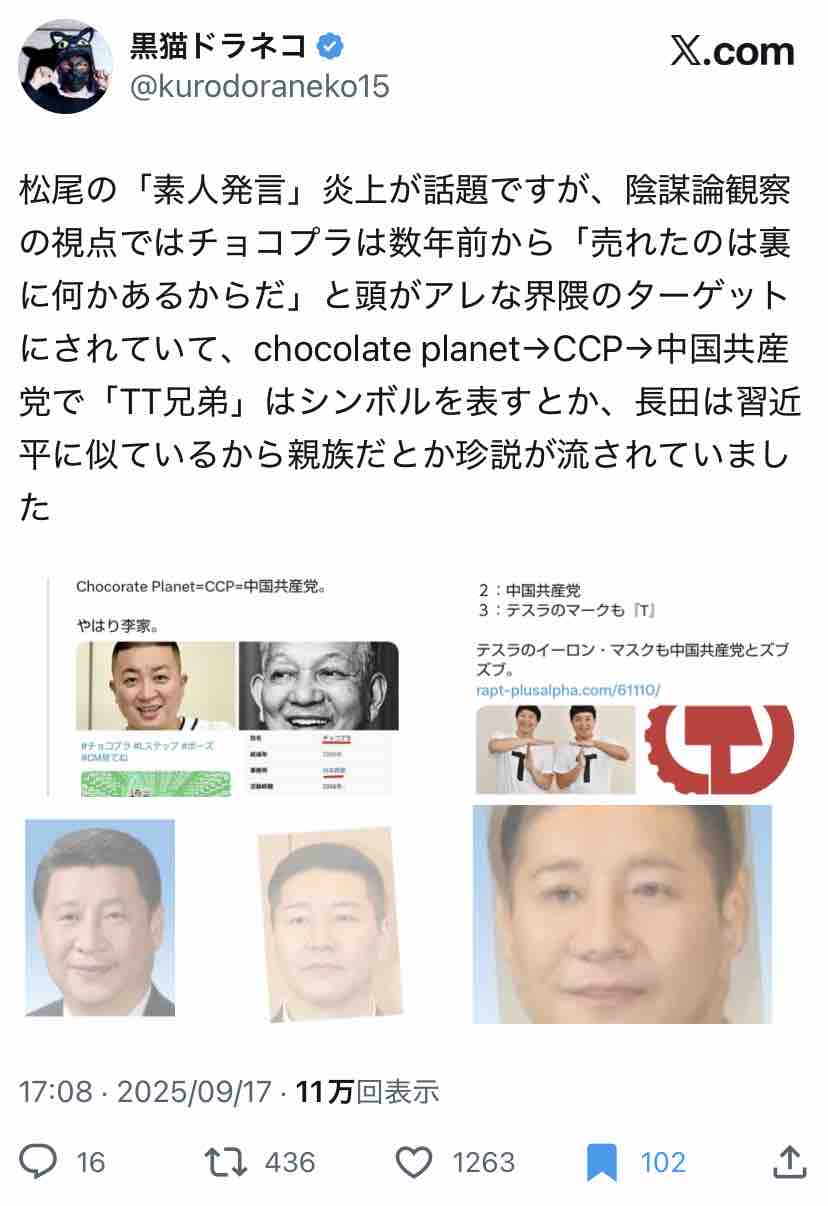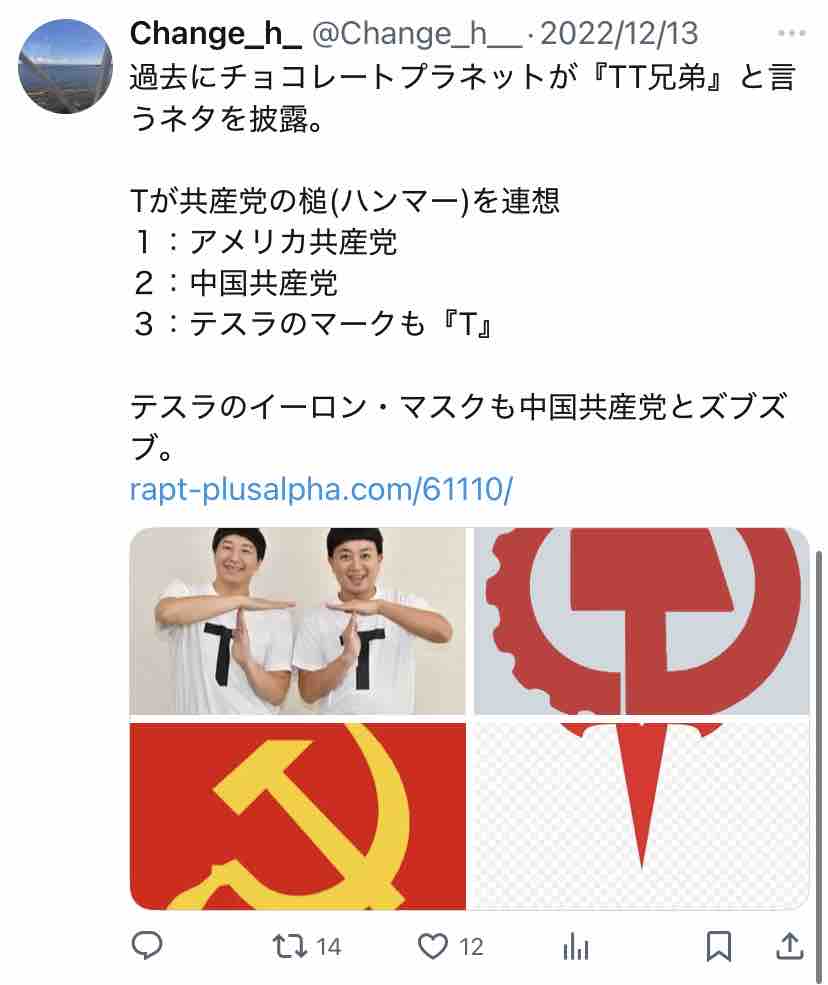 愚かな日本人どもめ、何も知らずに我らが中国共産党の名前を忍ばせたチョコプラの、鎌と槌を模したT T兄弟ネタで笑っておるわ!」