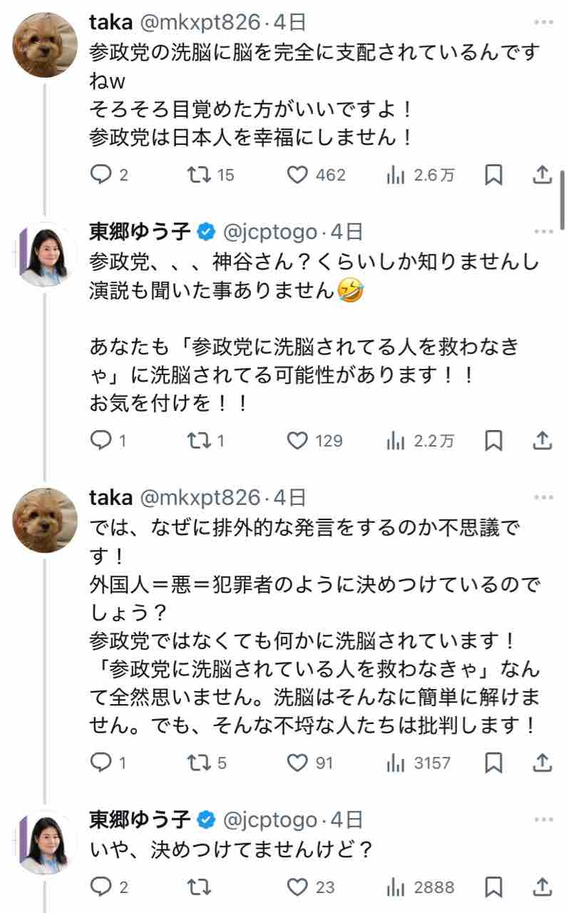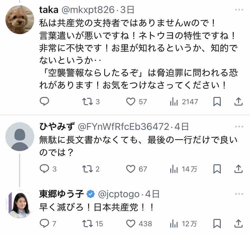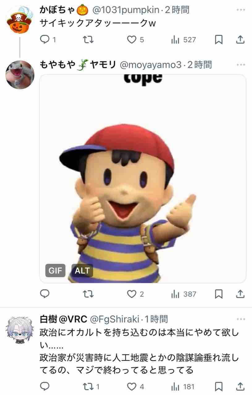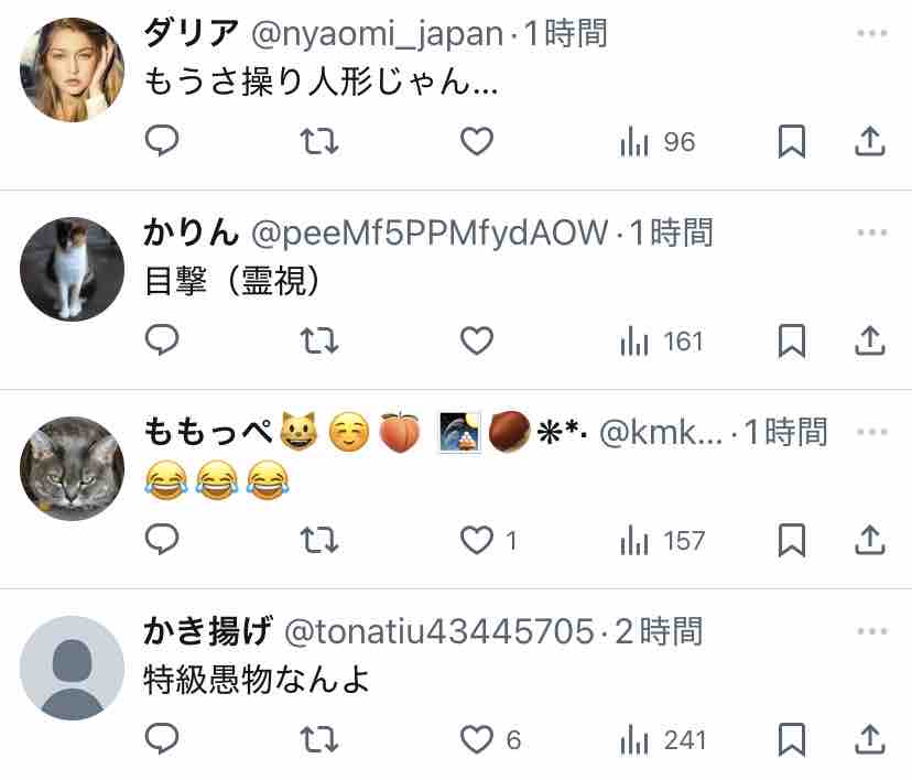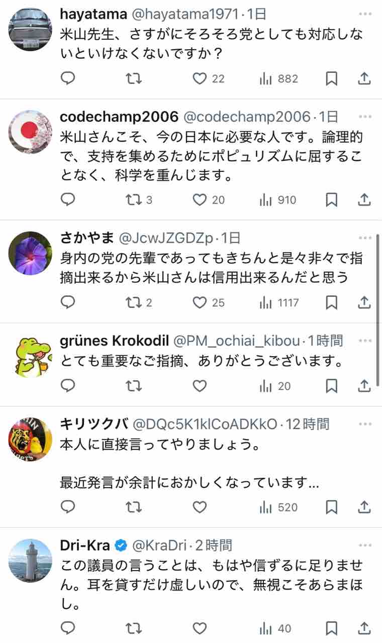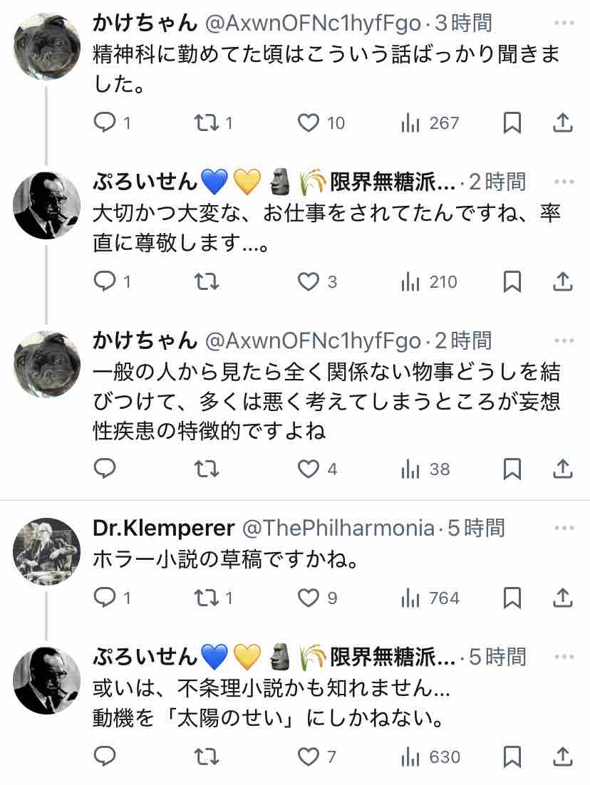 で、先程のポストへのリプライが↓こちら(表示順)。