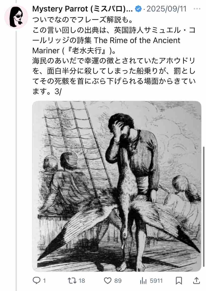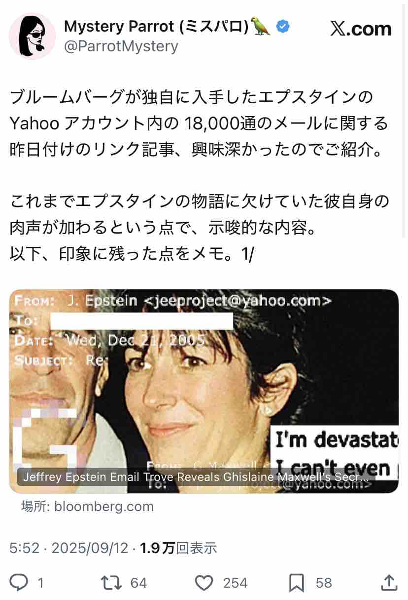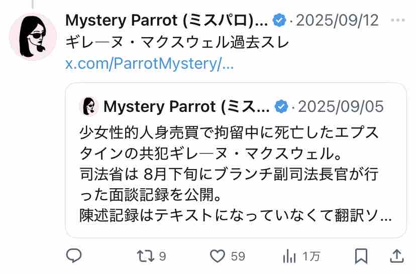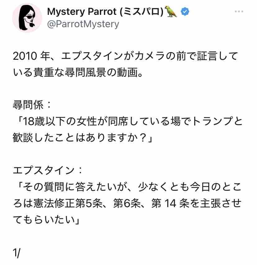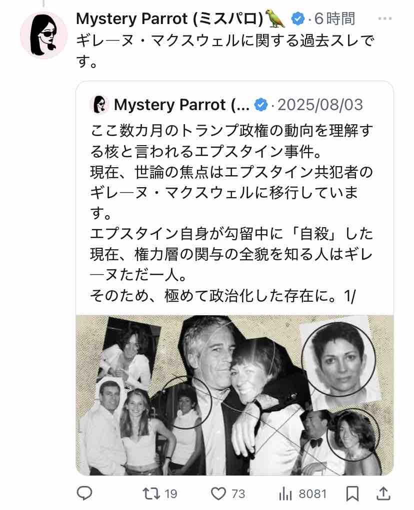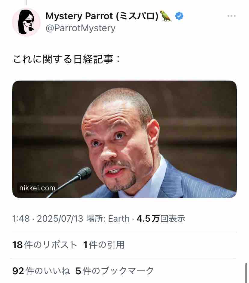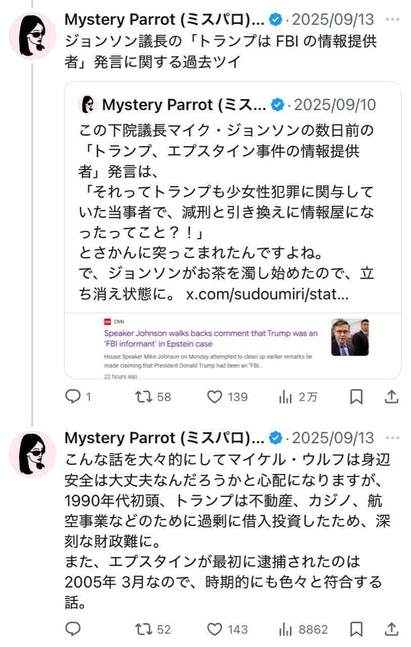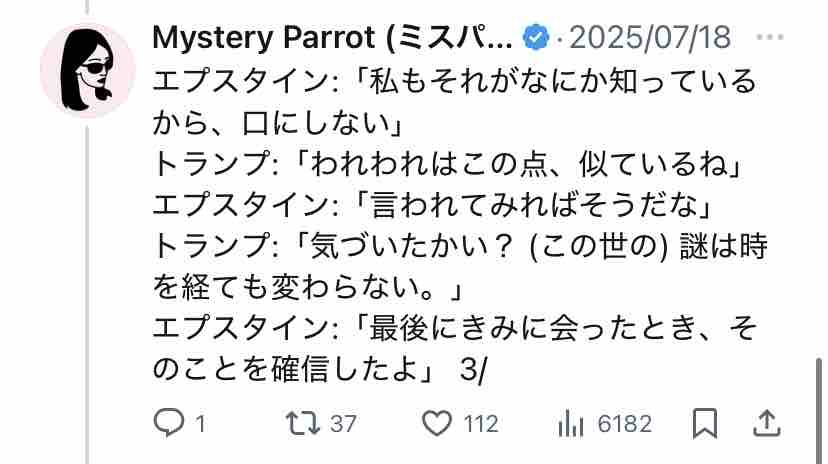 さて、当ブログがちょいちょい勝手にお世話になってる(つまり一方的に取り上げてる)X上のアカウント、「Mysterry Parrot(ミスパロ)🦜」…