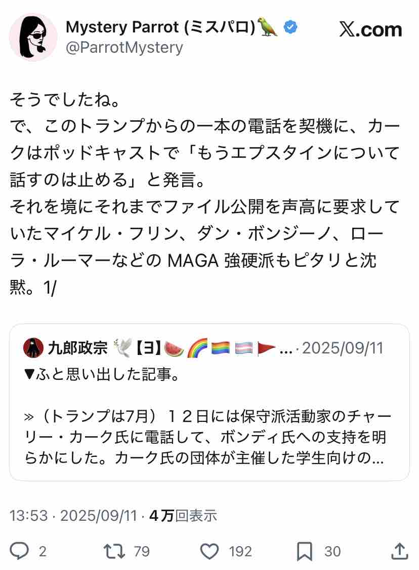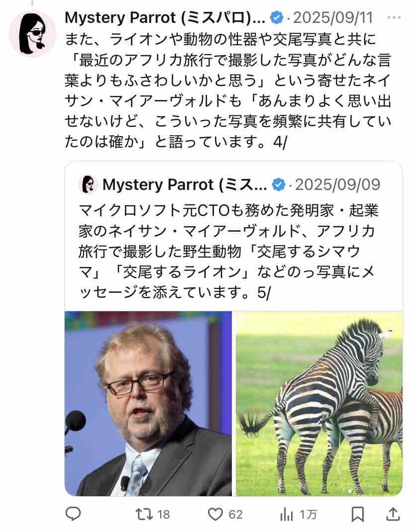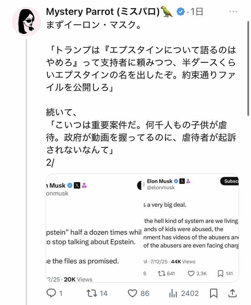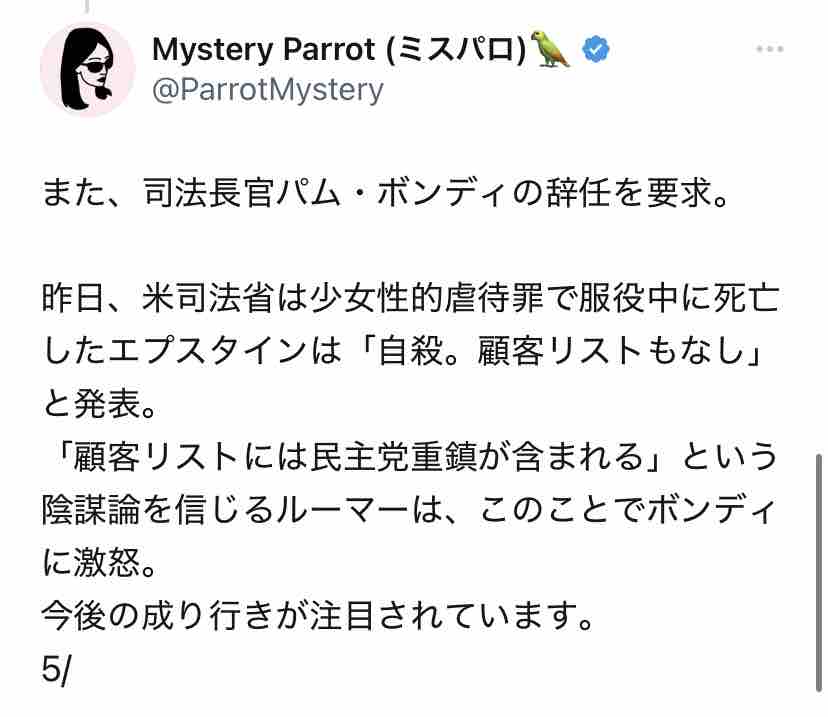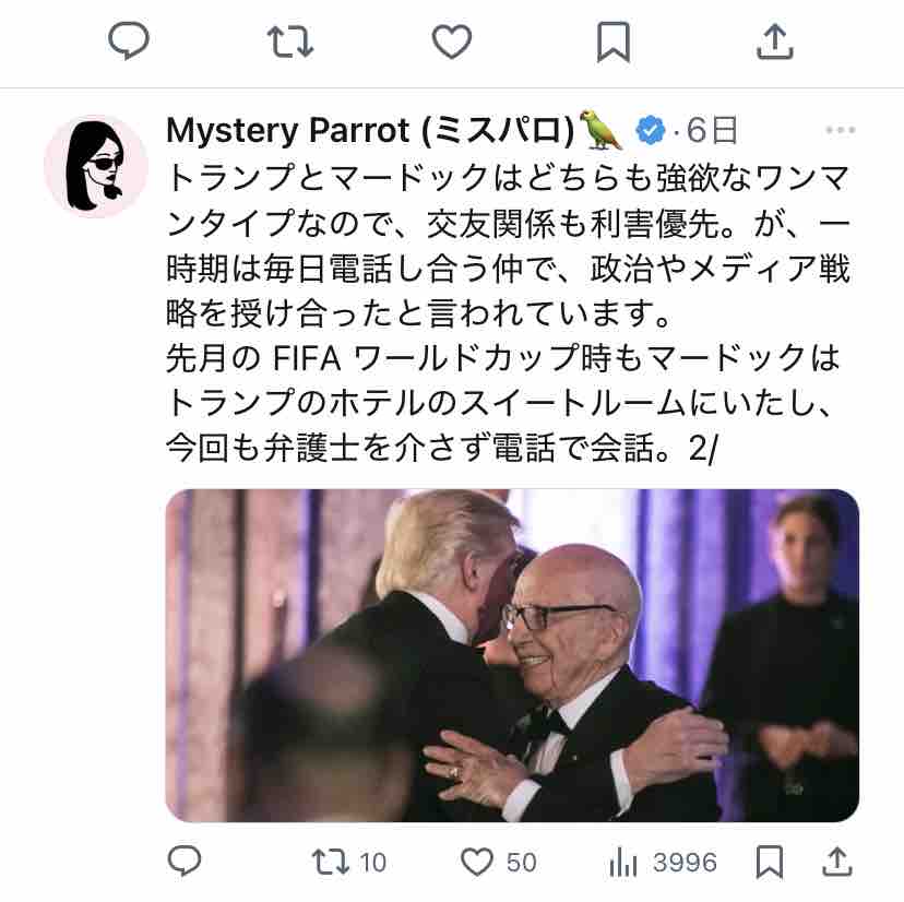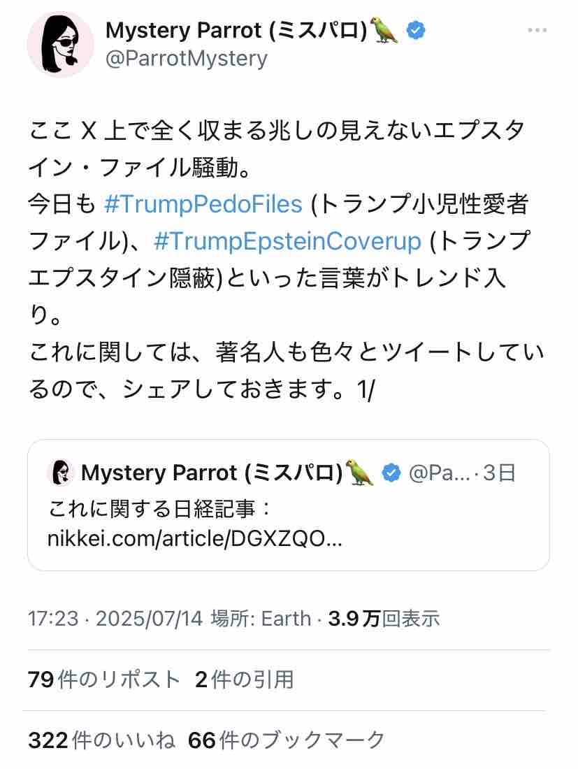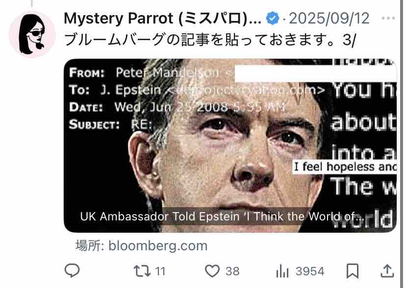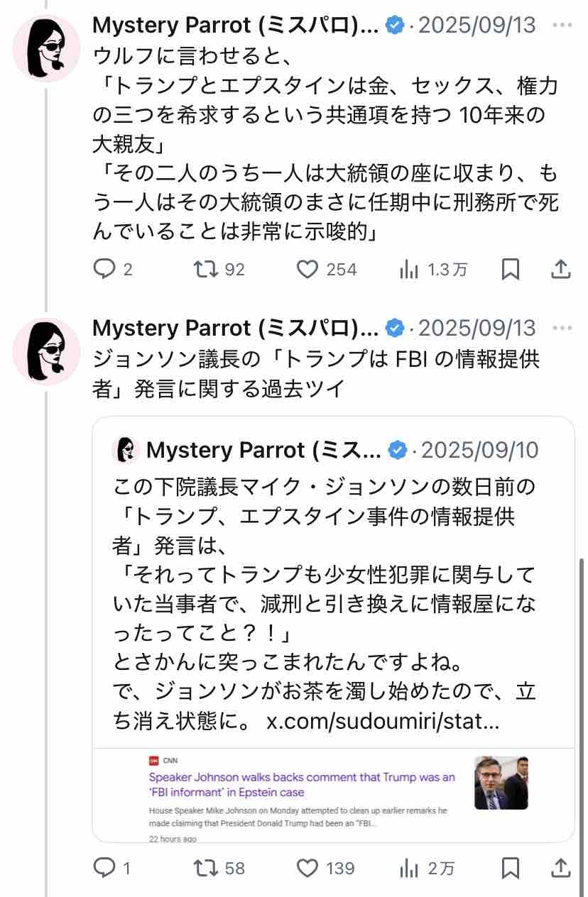 さて、当ブログがちょいちょい勝手にお世話になってる(つまり一方的に取り上げてる)X上のアカウント、「Mysterry Parrot(ミスパロ)🦜」…
