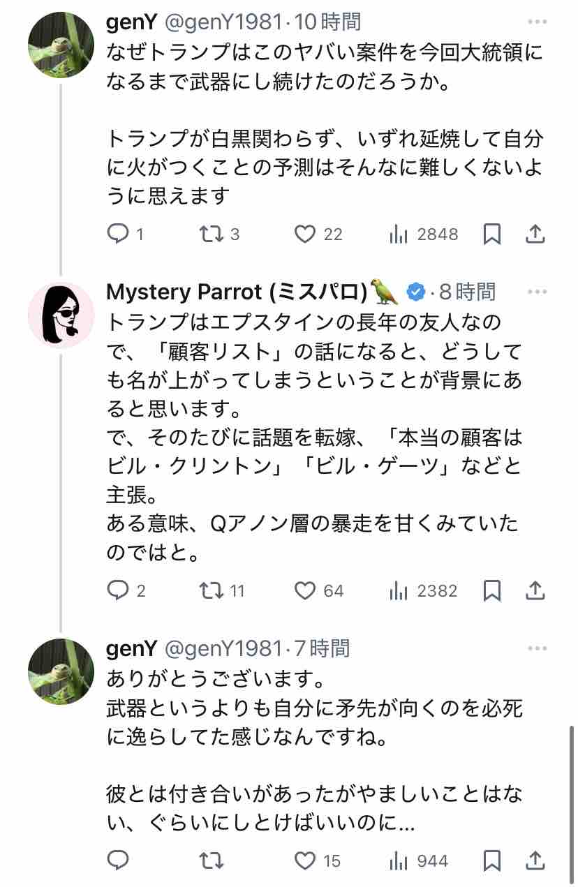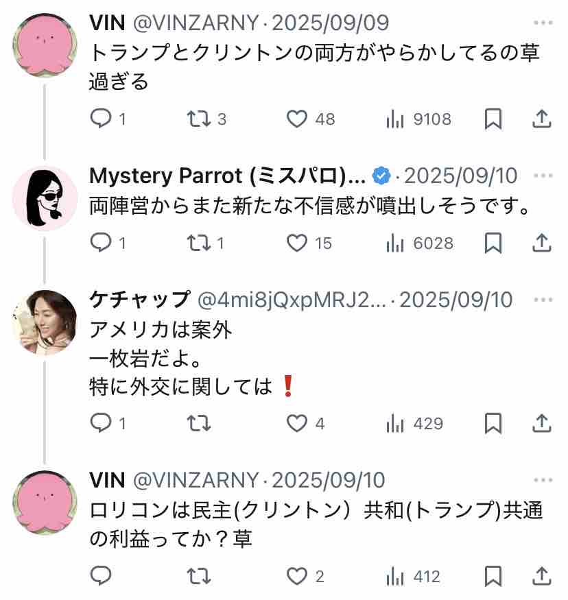 エプスタインが若い女性を使った性接待を利用し、ウヨサヨ問わず有力者と仲良しこよしになってたのは、別に陰謀論ちゃうやろ…
