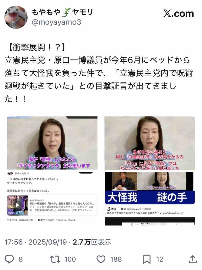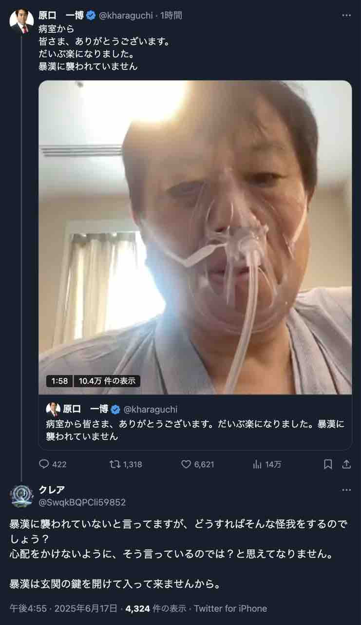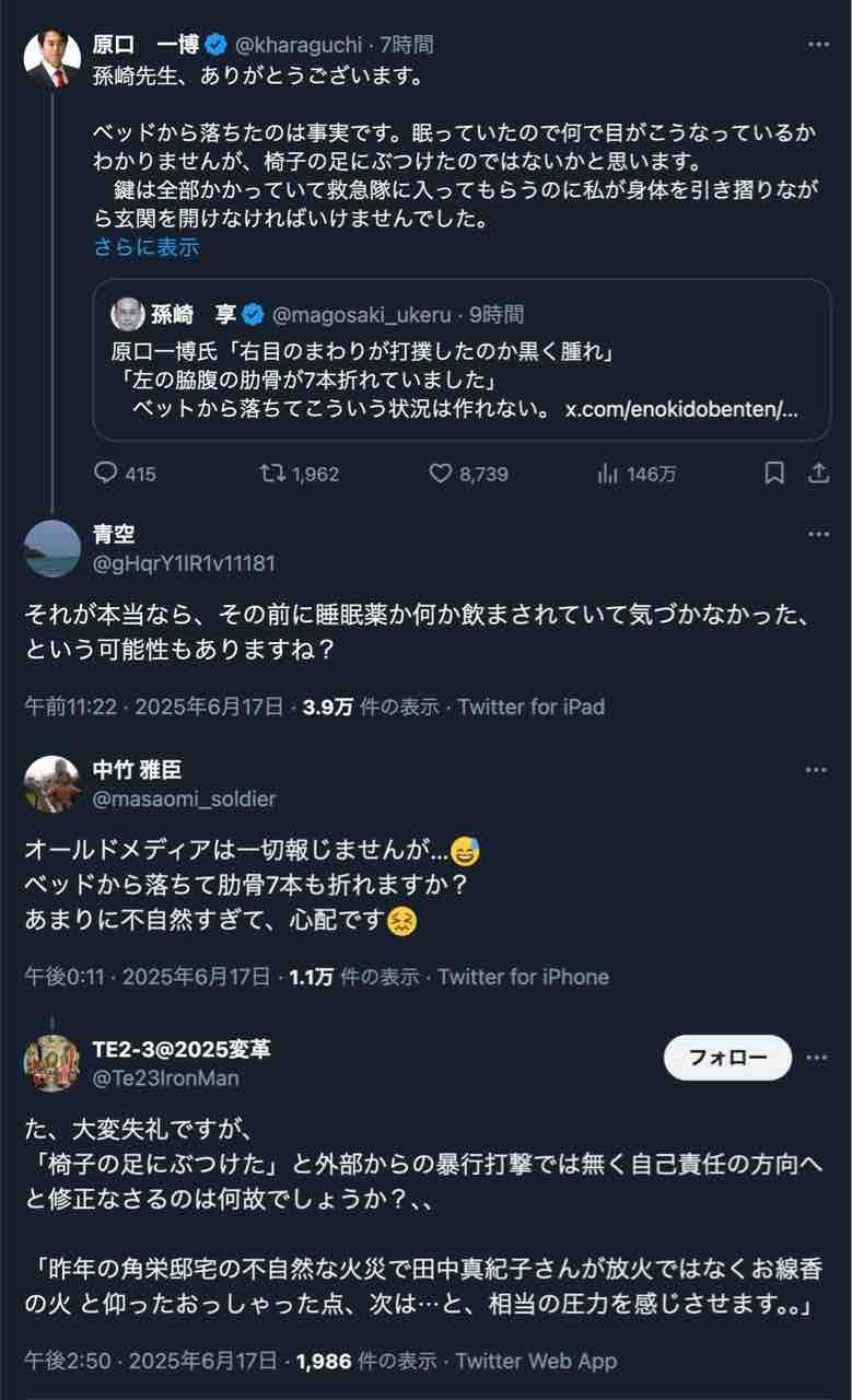 原口氏は17日、Xで「ベッドから落ちたのは事実」とした上で、目が腫れていることについて「椅子の足にぶつけたのではないかと思います」と指摘。家の鍵はかけていたといい、「暴行も受けていません。武道を少しですがかじっており、ここまでボコボコにされることはありません」とアピールした。