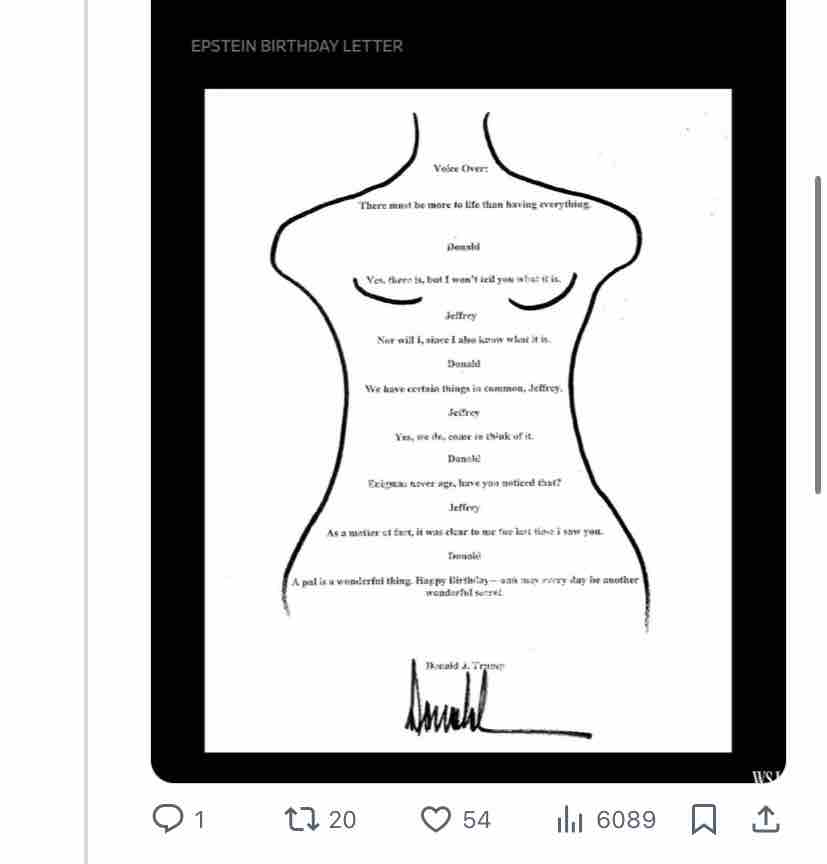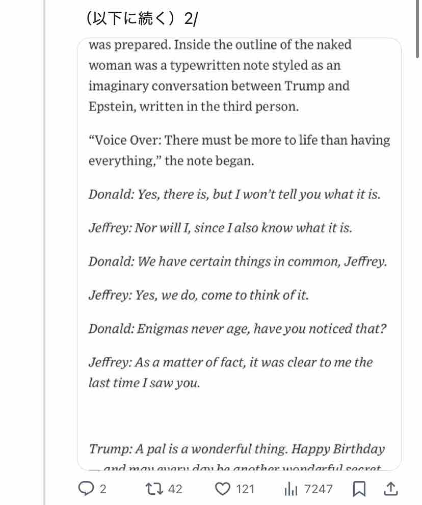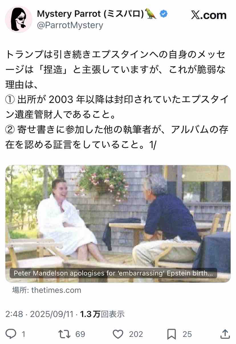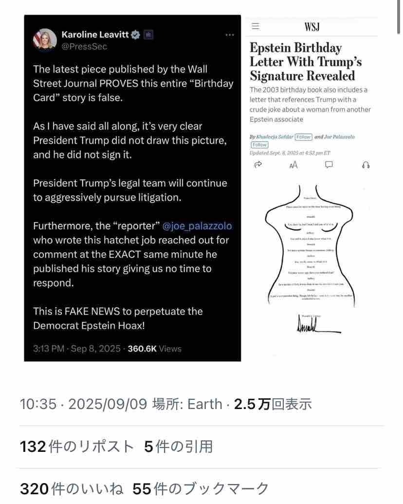 https://japan.storm.mg/articles/1066913『エプスタイン「バースデーブック」にトランプ署名疑惑 裸婦の下半身に「ドナルド」、否定も筆跡比較で矛盾』