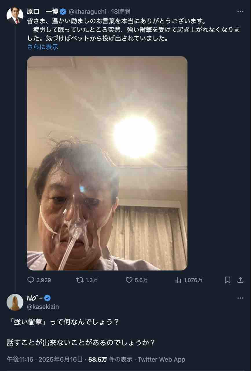 原口氏は「疲労して眠っていたところ突然、強い衝撃を受けて起き上がれなくなりました。気づけばベッドから投げ出されていました」と説明。「右目のまわりが打撲したのか黒く腫れ、左の脇腹の肋骨(ろっこつ)が7本折れていました」と明らかにした。