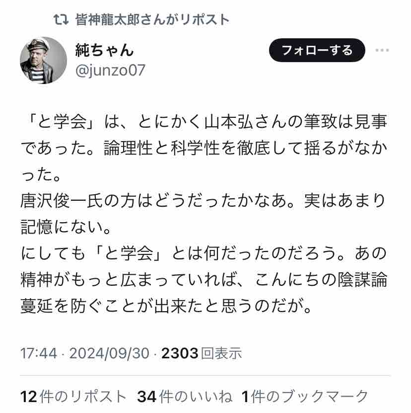 「物事を調査し、証拠に基づいて判断することを重視」を維持してくれれば、ビリーバー側でも役に立つからでしょう。石川幹人氏や羽仁礼氏や蛭田立氏らのASIOSでの立ち位置はそうなのでしょう。