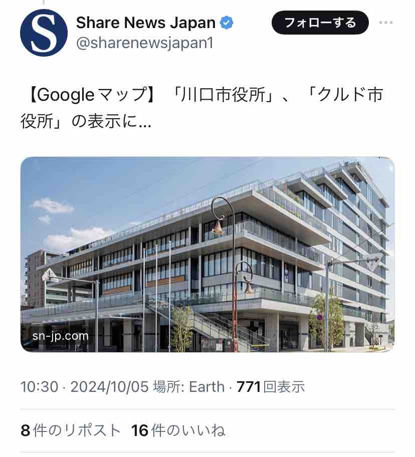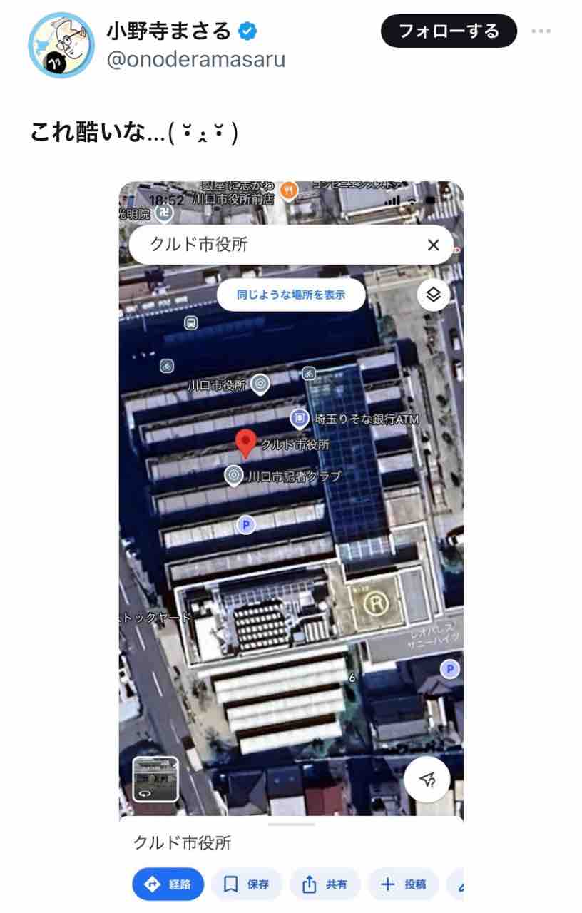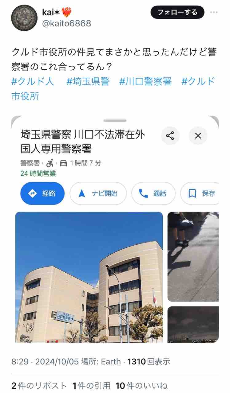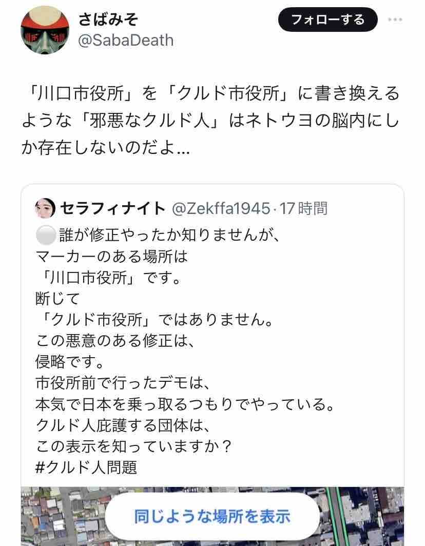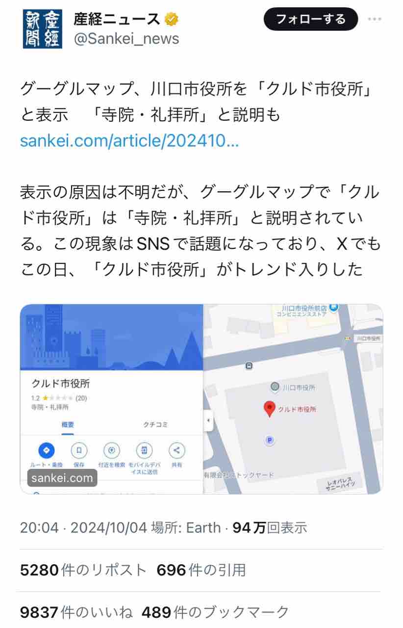 誰のイタズラか、Googleマップで川口市役所が「クルド市役所」と表示される様になって話題に。