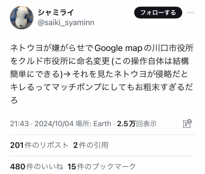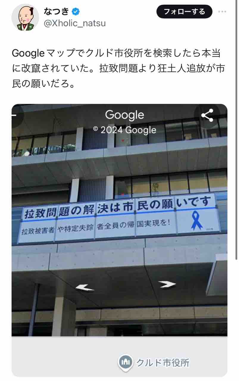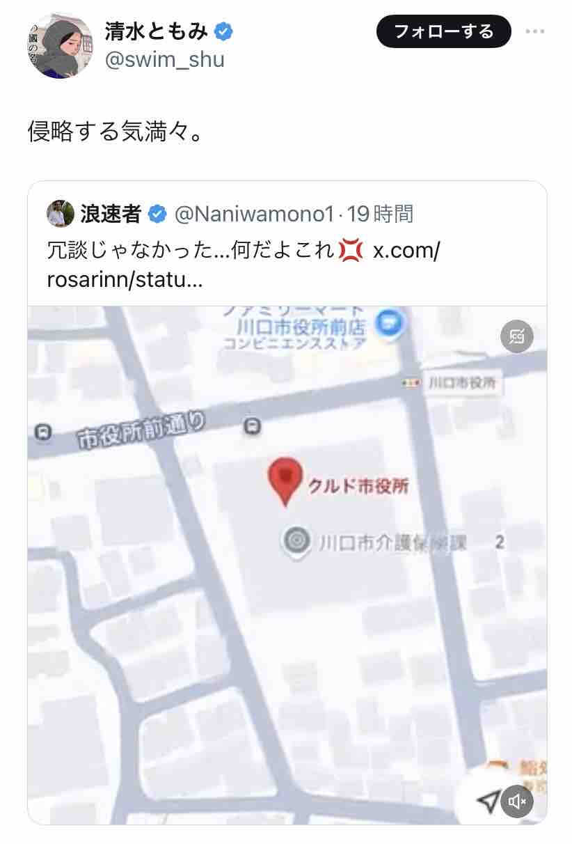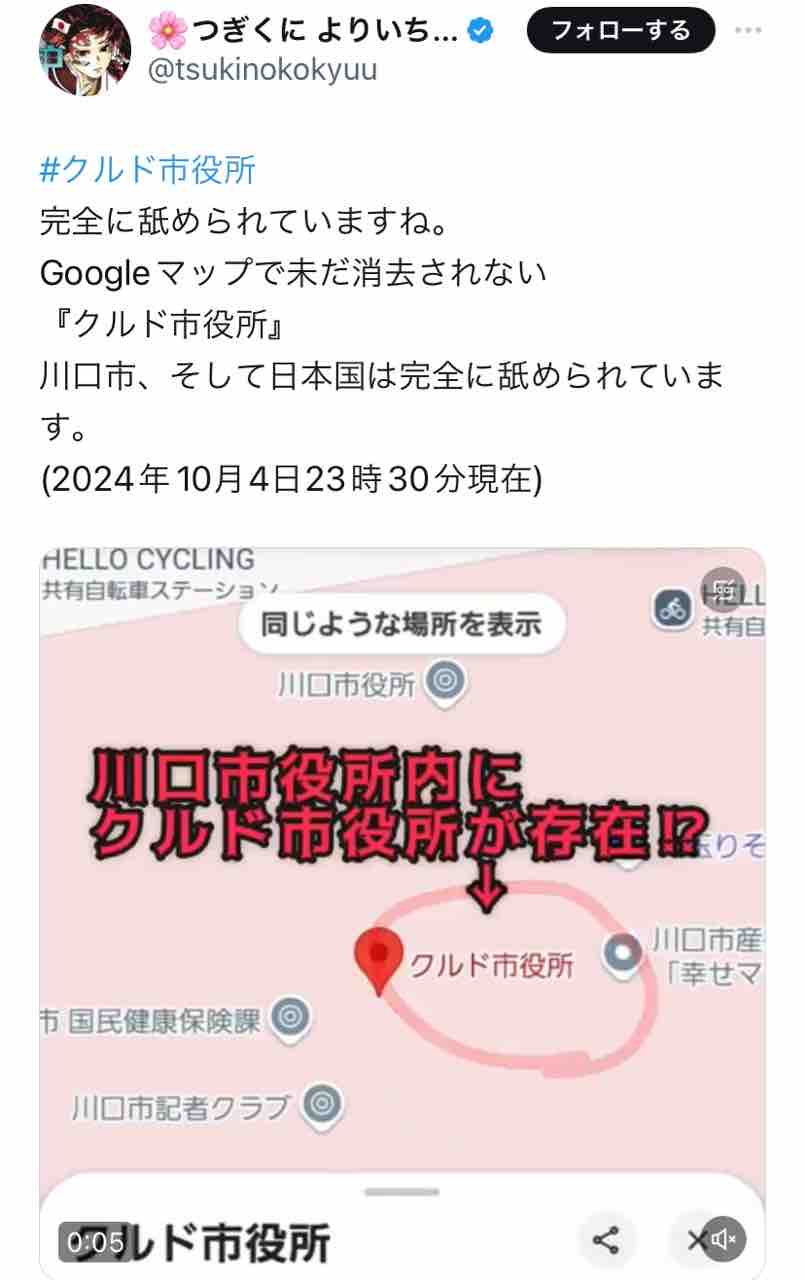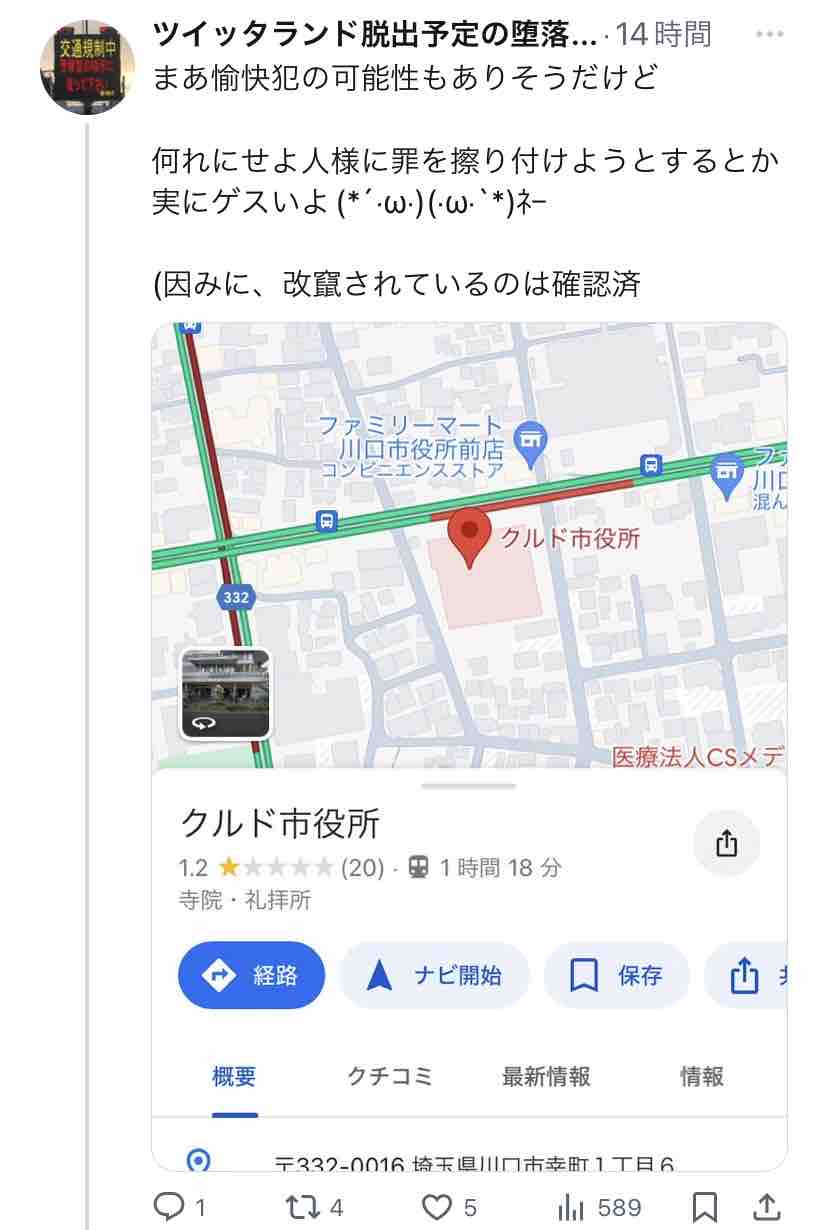 誰のイタズラか、Googleマップで川口市役所が「クルド市役所」と表示される様になって話題に。