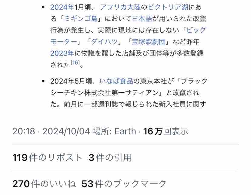 2024年1月頃、 アフリカ大陸のビクトリア湖にある「ミギンゴ島」において日本語が用いられた改竄行為が発生し、実際に現地には存在しない「ビッグモーター」「ダイハツ」「宝塚歌劇団」など昨年2023年に物議を醸した店舗及び団体等が多数登録されたのはビッグモーターやダイハツや宝塚歌劇団の関係者の仕業で