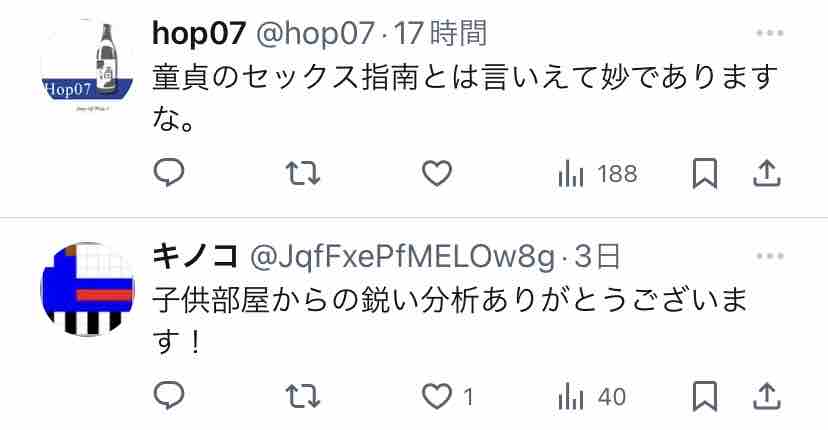 コレは暇空茜の右腕・なるが↓こんなん言うて「童貞がSEX指南してるみたい」と評判になった、というもの。