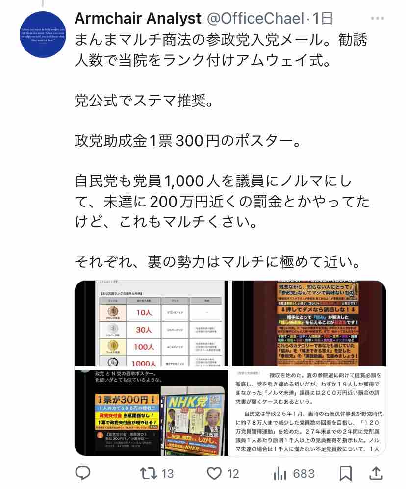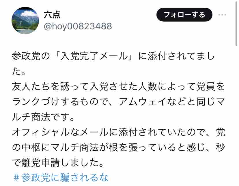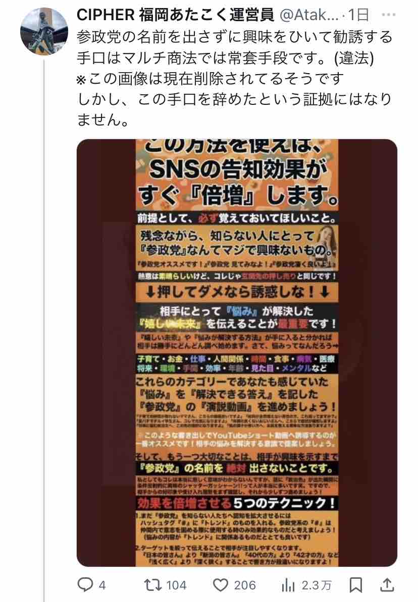 参政党、勧誘人数でランク付けするマルチ商法システムを採用。政党名を隠しての勧誘もマニュアル化