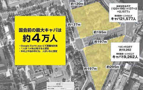 さらに国会前の人が入れる部分の面積を計算し、「最大キャパは約4万人」とする人が登場。
