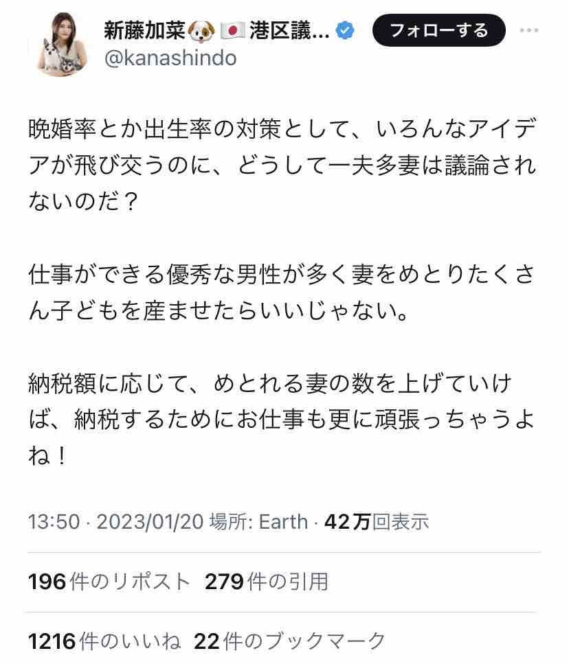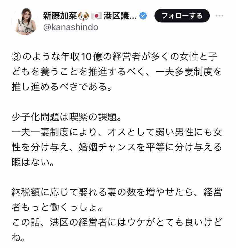 しかし新藤加菜は『優れた遺伝子を持つ』男性に多数の妻をあてがう、という『異次元の少子化対策』を提案しているお方。