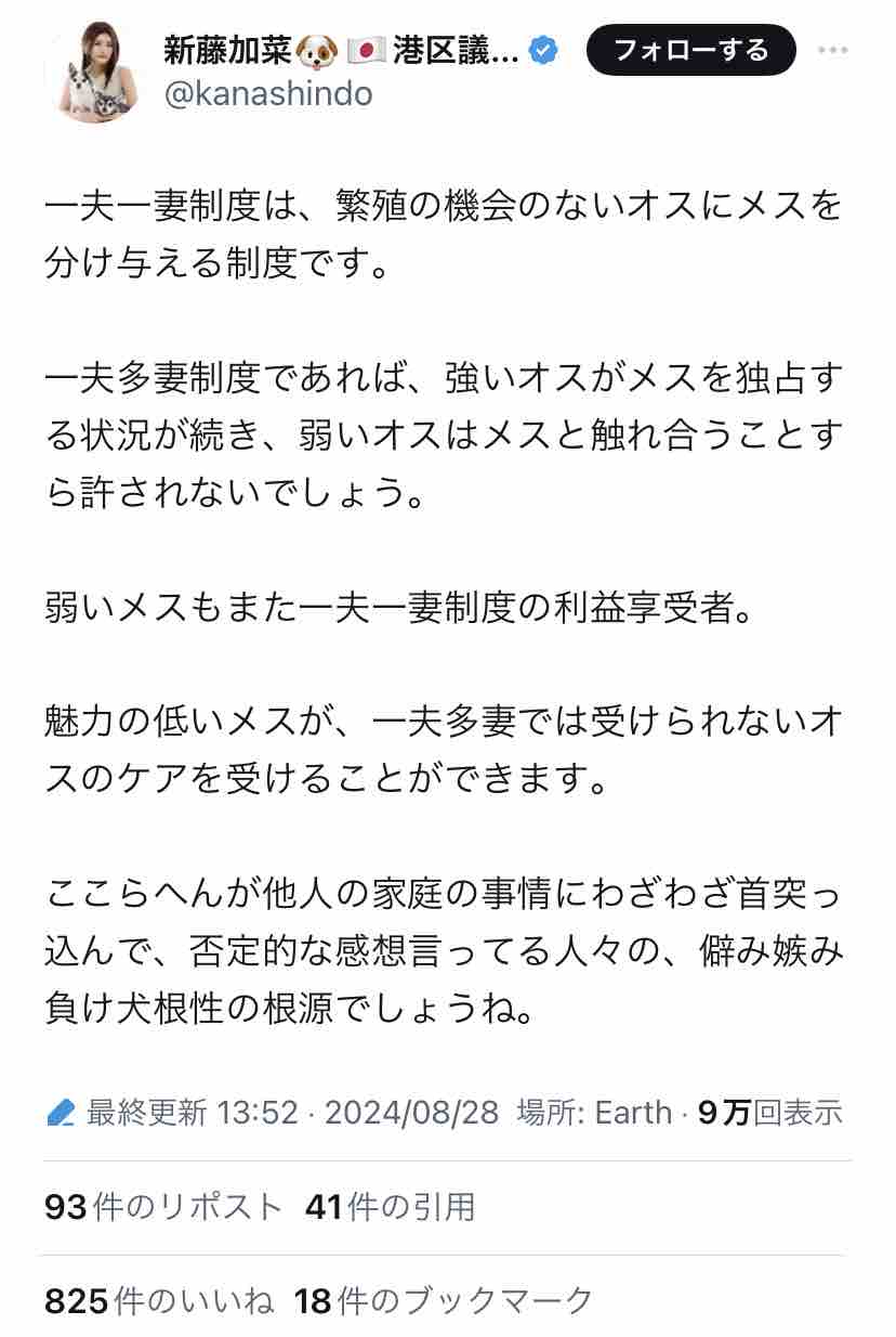 その前にちょっと復習しておくと、一夫多妻をめぐる新藤加菜の主張は↓こんな。
