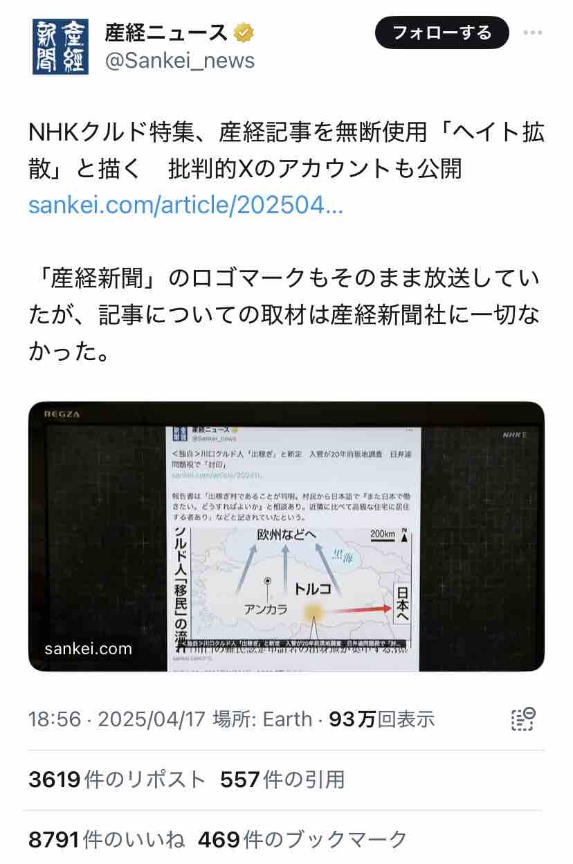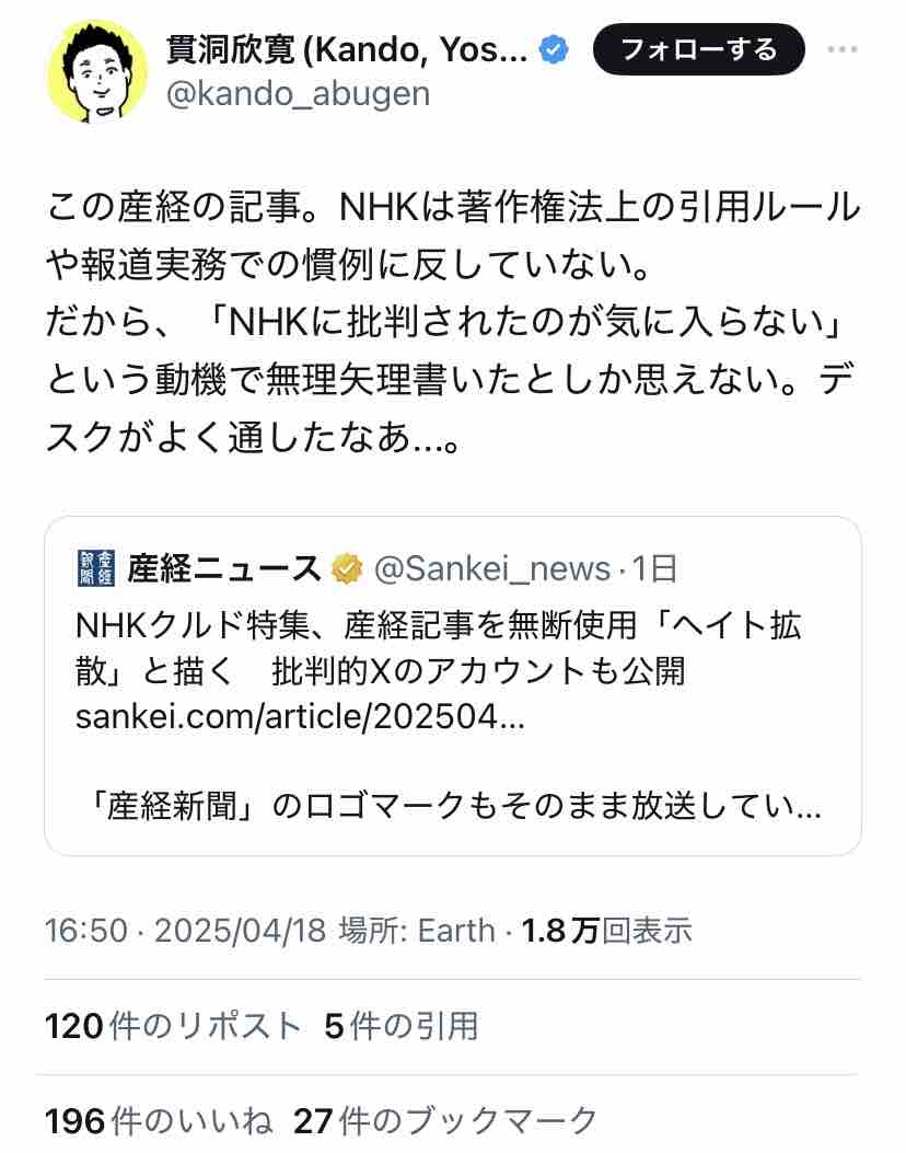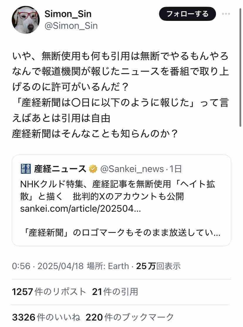 「じゃあ産経はこの記事を書くにあたってNHKにいちいち了承を得てんのかよ」
