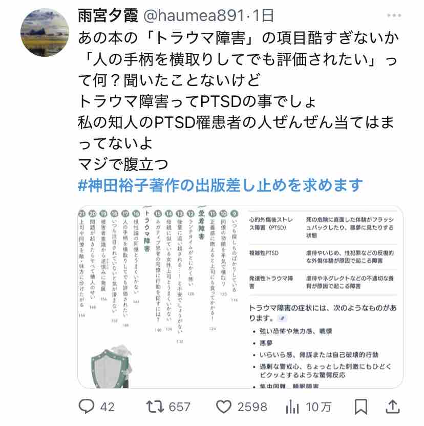 一方でX上では『#神田裕子著作の出版差し止めを求めます』がトレンド入り。