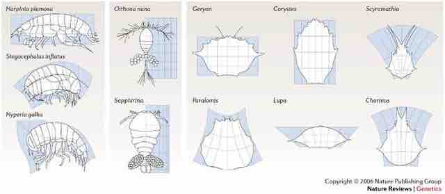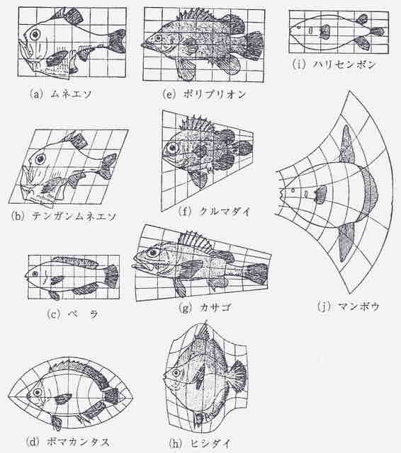 ダーシー・トムソン(トンプソン)の古典的な「変形の理論」によれば、多くの動物はその祖先のフォルムを一定の数学的変換によって変形させたものとして説明できるという。
