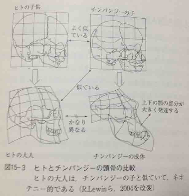 ヒトでは子供と大人であまりフォルムに差がなく、しかもそれらはチンパンジーの赤ん坊と相似であることに気がつくだろう。