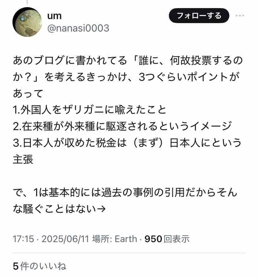 不安を持つ人に吐き出させる行為を実施させる事で、本人が何にどういう不安を抱いているのか、そのディテールを明確にさせる試みが欠けているんですよ。それをすれば、じゃあその人の持つ不安に対して言葉を尽くして対応するアプローチする事ができるよね、となるんです、普通はね。でも、それをすっ飛ばして、「そんな不安持つのは頭がウヨってるからでしょ」と雑殴りしてしまう昨今の左派系の言動、態度に危機感を覚えています。その態度こそが、グレーゾーンでウロウロしてる、言葉を尽くせば引き返せる人たちを、ブラックな領域に押し込んでいる側面はあるんだろうなとも思います。(もちろん、不特定多数の目に入るオープンなブログに公開するものではないし、ブログサービス提供元も普通の企業であればヘイト表現しちゃダメだよという文言を規約に入れているはずですので、初版については通報を受けた運営さんから削除されてもおかしくはない記事ではあります。)