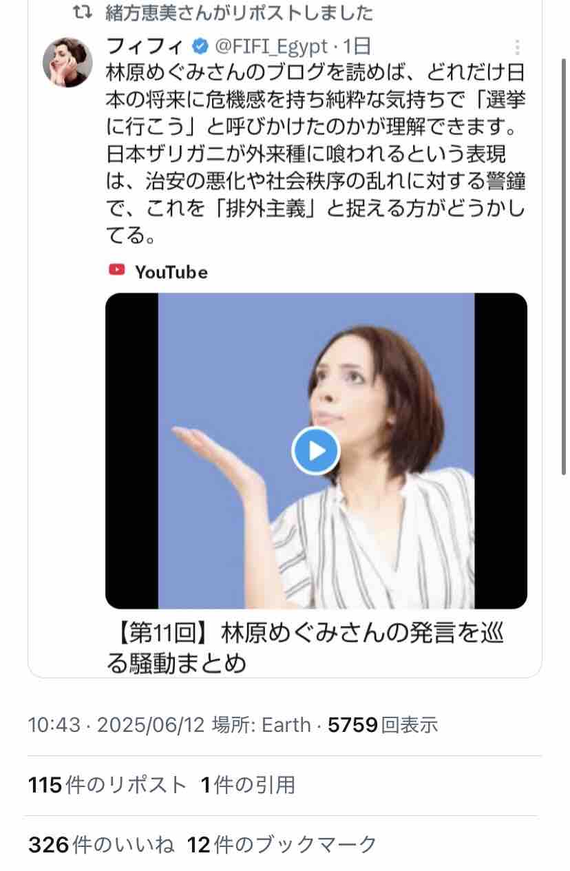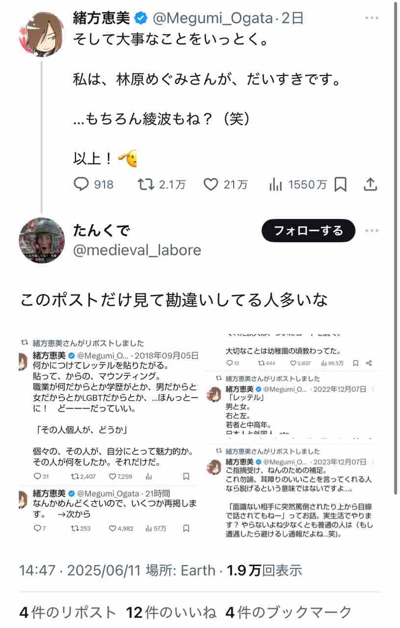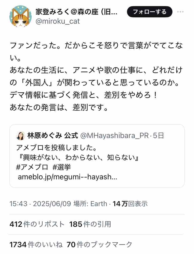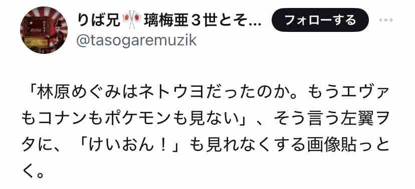 で、例のこまめという人が「もし林原めぐみが左寄りだったら逆の解釈するよね?」という妙にリアルな↓指摘を。