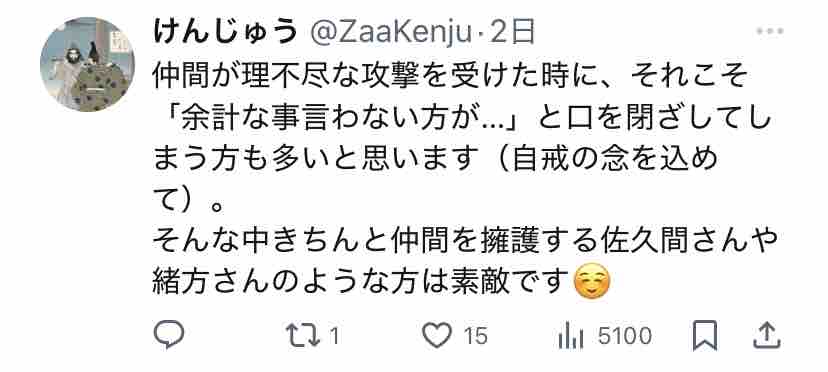 佐久間レイのツイートは「問題発言の所だけ持ち上げてアレコレ決めつけるのではなく、もう少し傾聴した方がよいのでは」という提言のような物だと思ったので、「出た出た、ウヨちゃんお得意の「言いたいことも言えない世の中じゃ〜♪」じゃん(笑)」みたいな嘲笑チックな物書きは、ネトウヨがよくやる「出た出た、チ〇ン名物韓国起源説(笑)」みたいな下品な囃し立てと変わらないなと思った