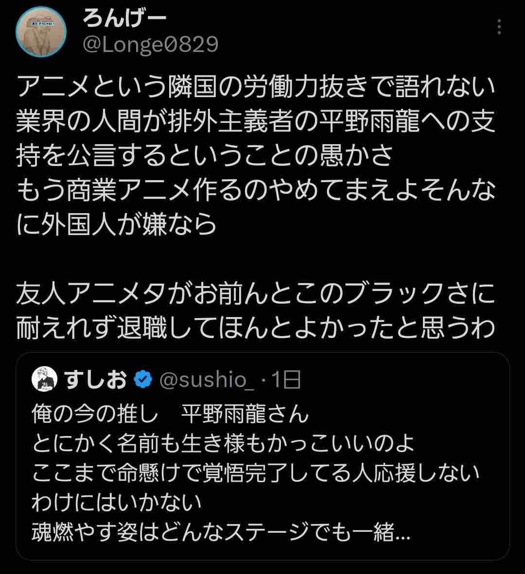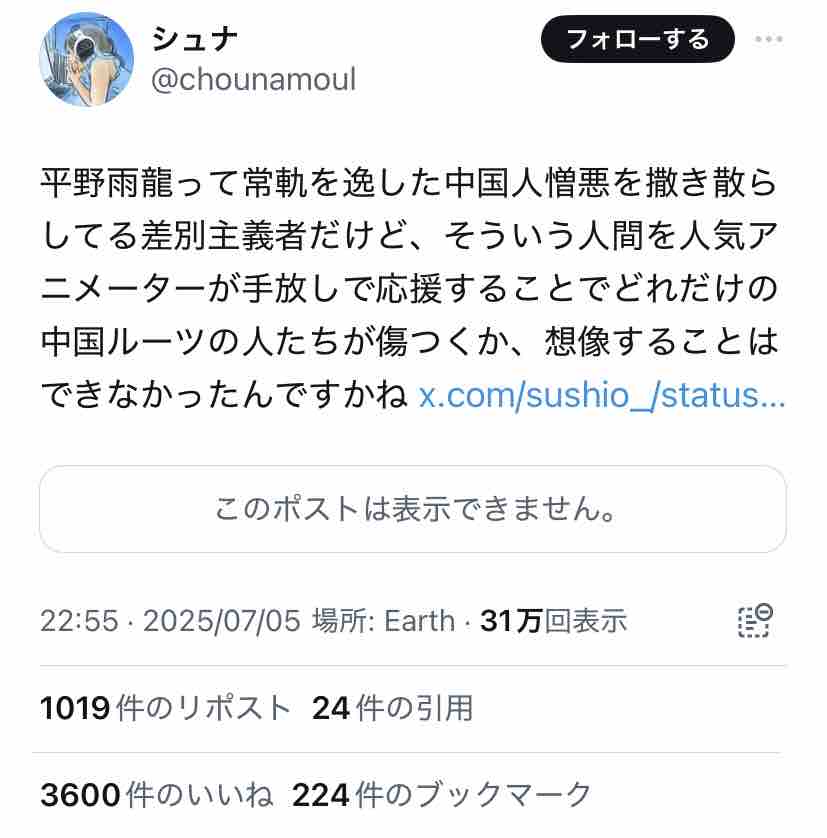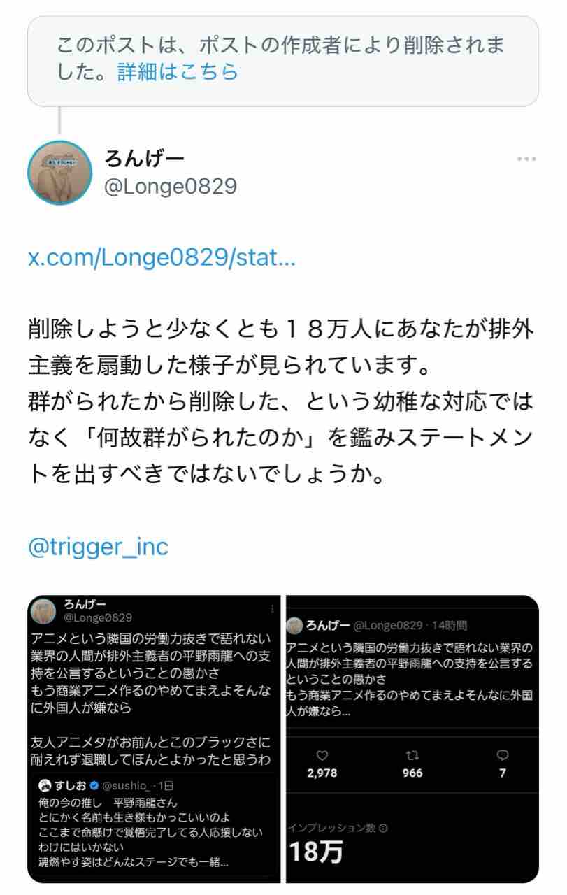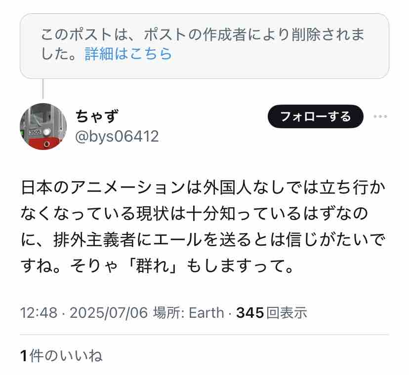 問題になってるアニメーターご本人がポストを削除したらしく、何があったのやら。