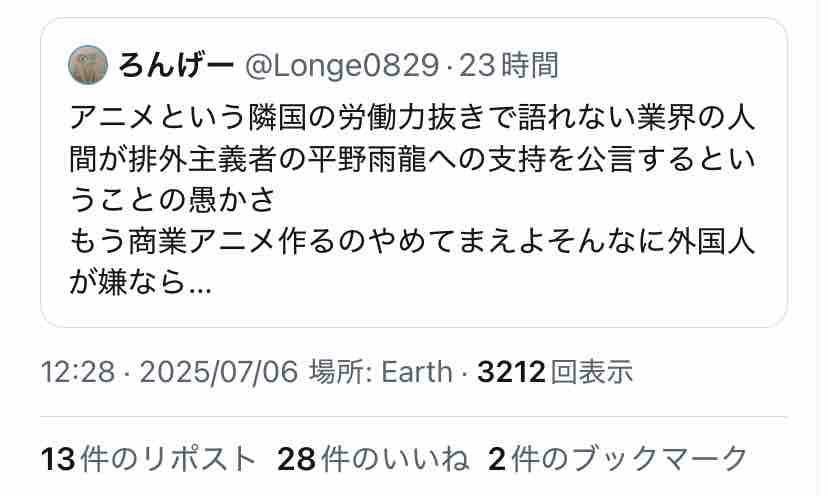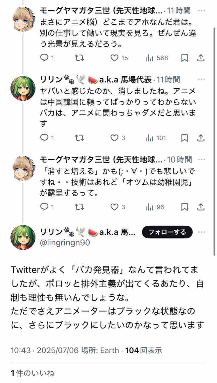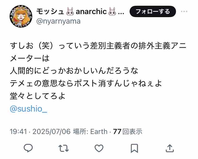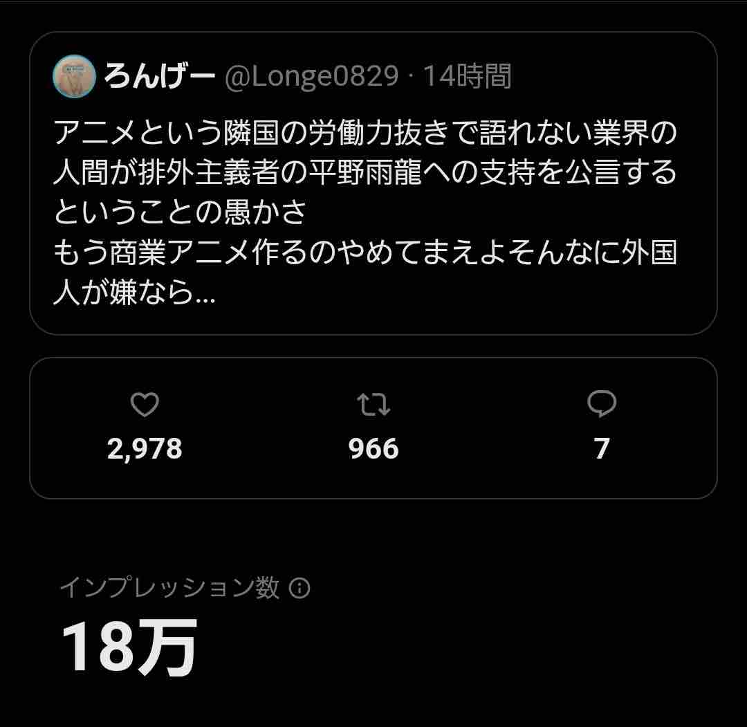 問題になってるアニメーターご本人がポストを削除したらしく、何があったのやら。