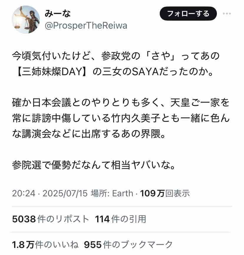参政党の「さや」、竹内久美子・杉田水脈と動画で共演、新藤加菜とは同じ田母神ガールズ出身。極右女子の派閥を超えた熱き連帯…これもう半分パヨクやろ
