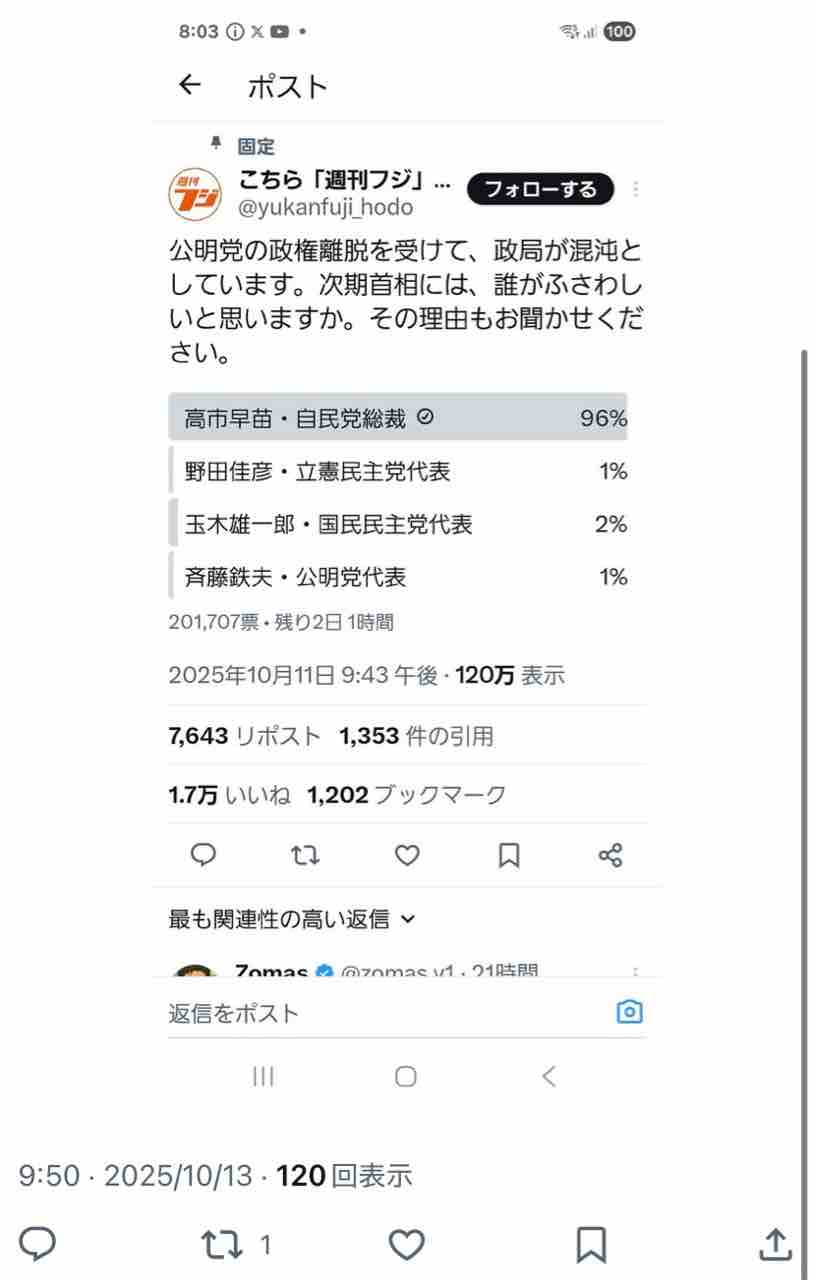 『「週刊フジ」のXアンケートに28万票もの投票、「次期首相」は高市早苗氏95%トップ』