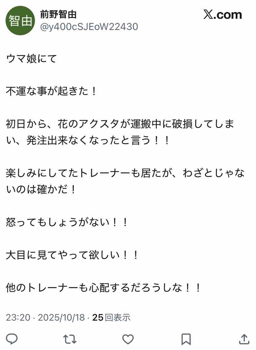 ウマ娘フィギュアを掲げたやつが暴れてたと聞いて若いやつかと思ったら、案の定オッサンと言う