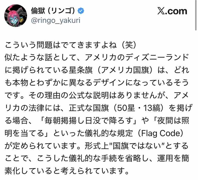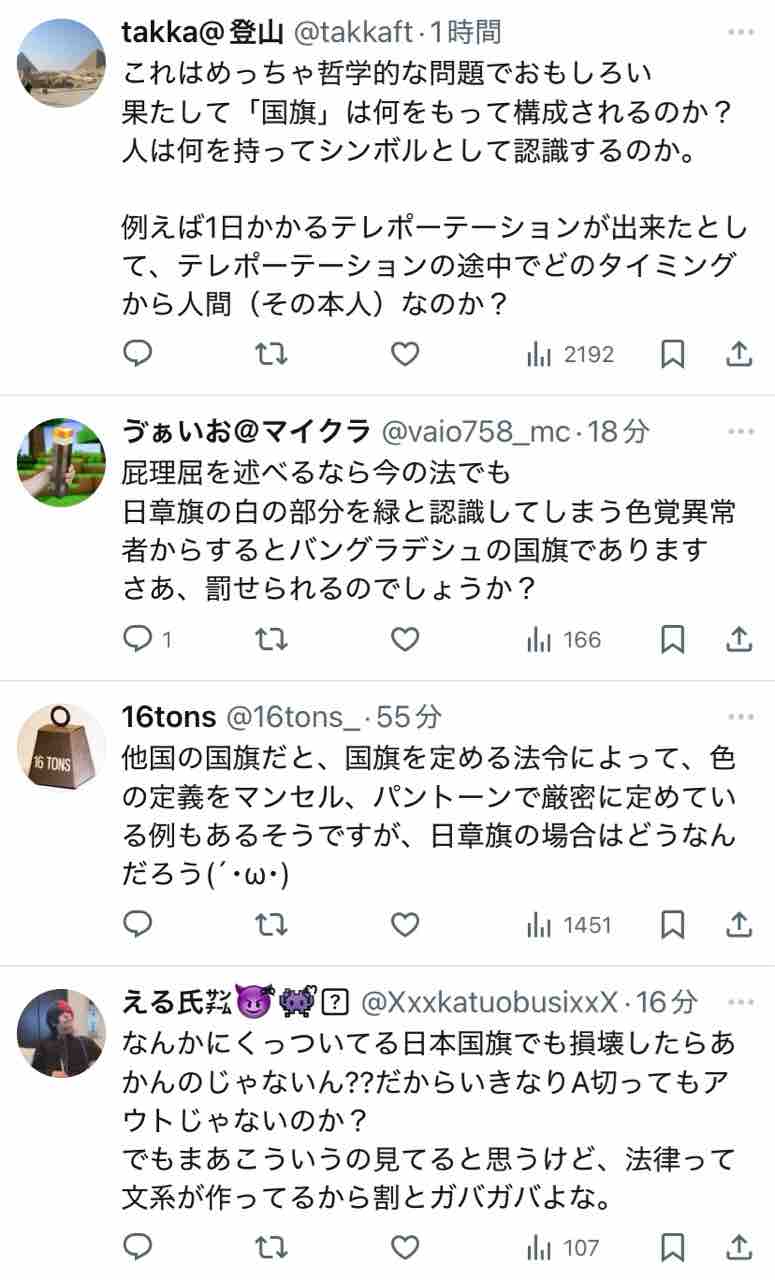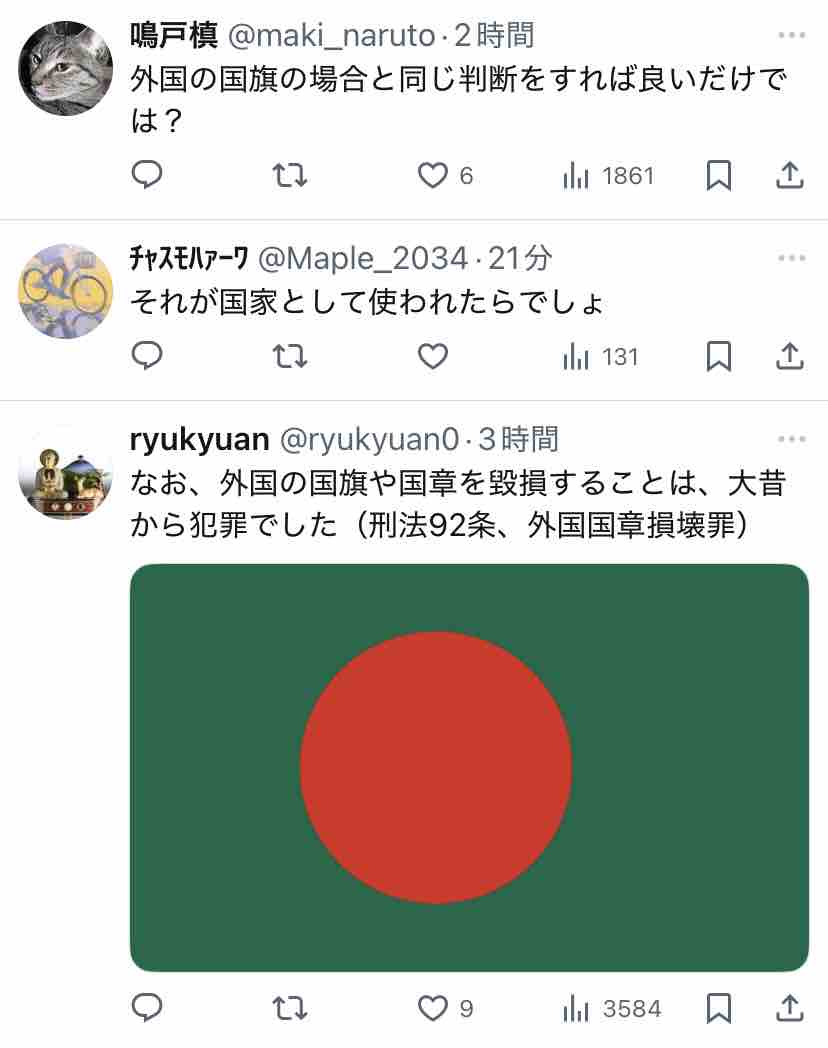 けどまぁ、変な人たちが政治的なパフォーマンスで日の丸や旭日旗を国内で燃やしてるのを注意するくらいはできるかなってとこじゃない?