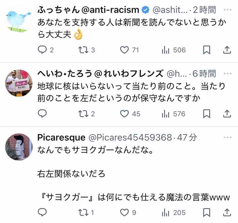 ウヨちゃんは核廃絶とかヘイトスピーチ反対とかを