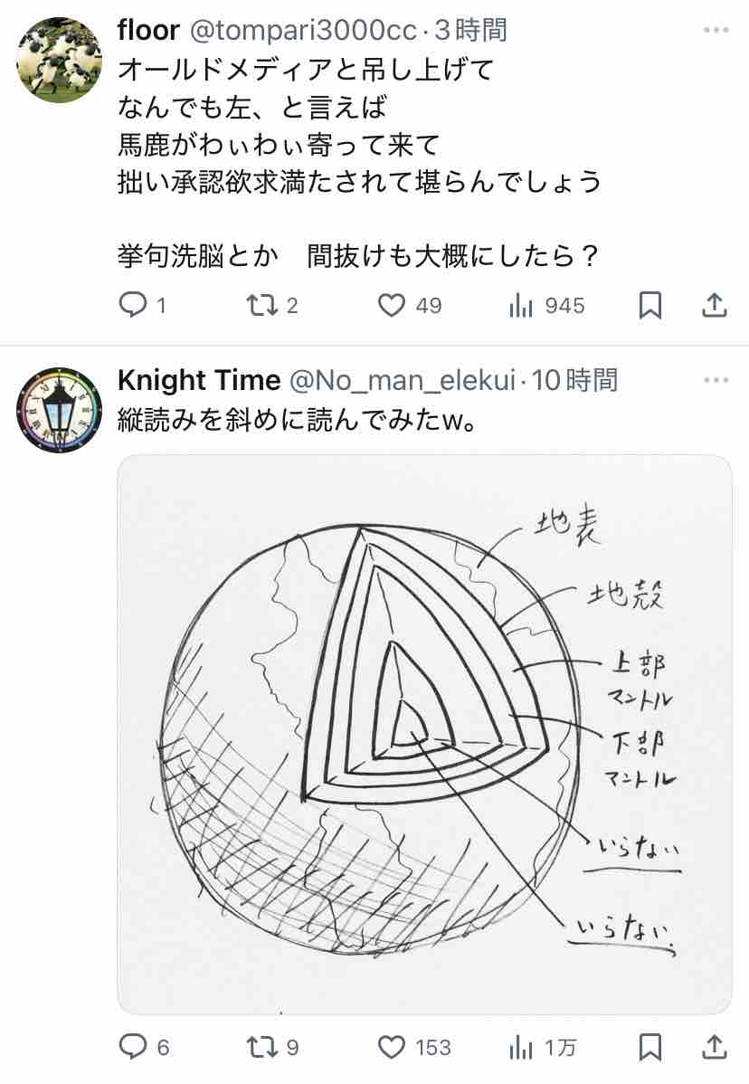 ↑この地球の断面図のやつは「核」を核兵器ではなく、地球の核(コア:内核と外核に分かれる)のことだとわざと誤解してみせる冗談。