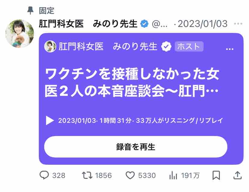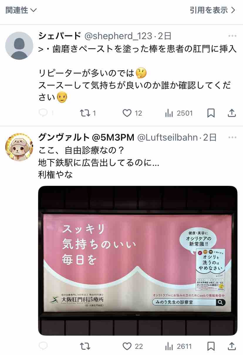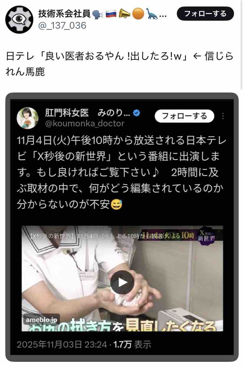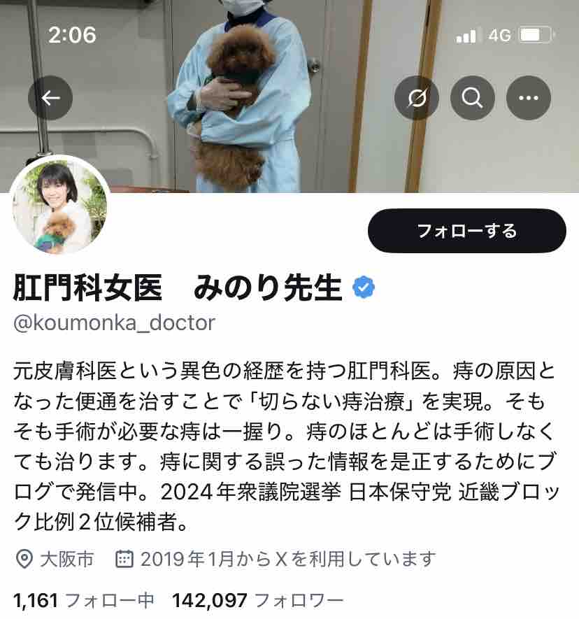 そして「肛門科女医 みのり先生」(自分で「先生」って付けるんや!?)は↓こんな方の模様。