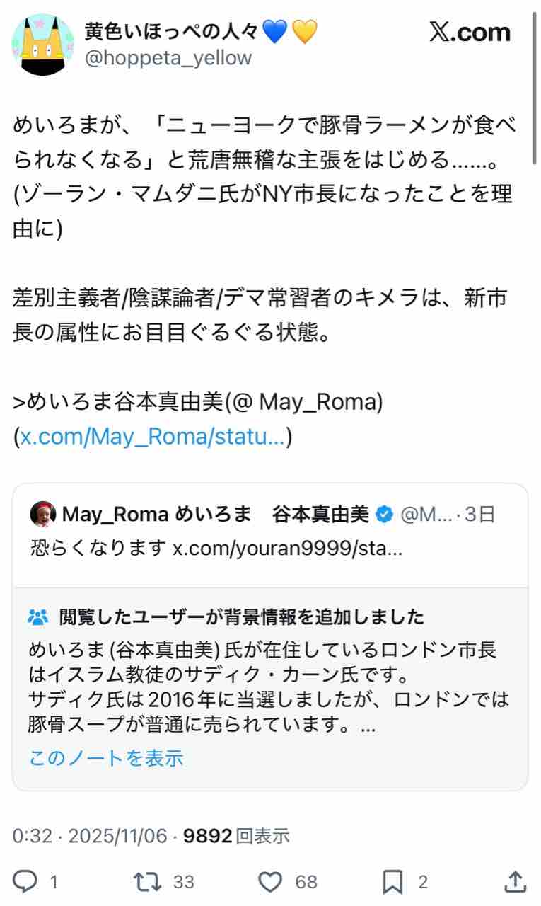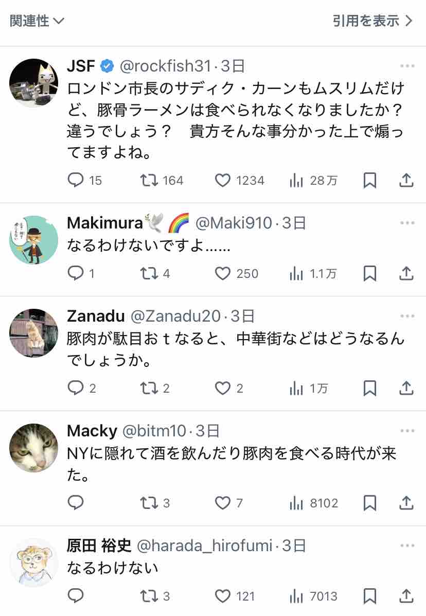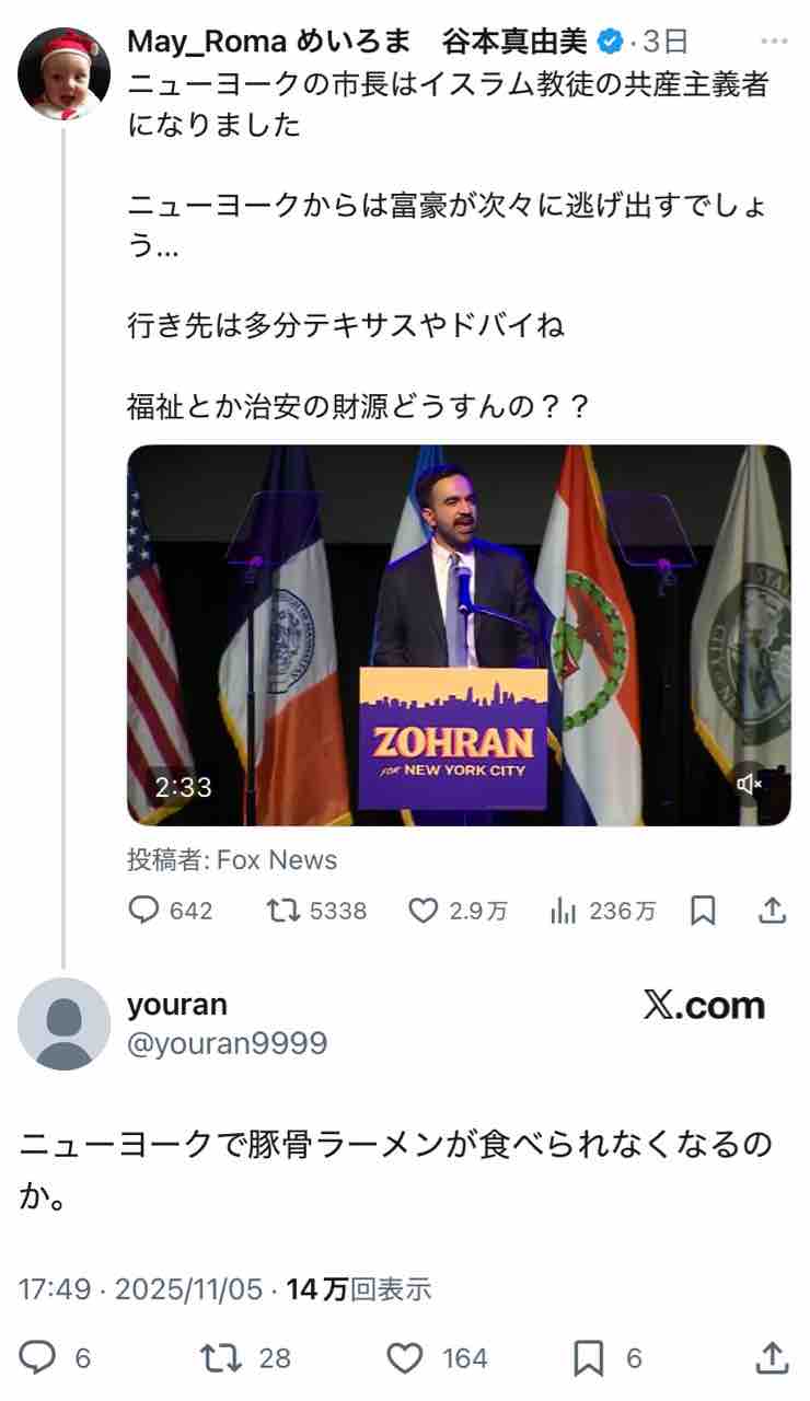 「市長がムスリムだから、ニューヨークでは豚骨ラーメンが食べられなくなる」