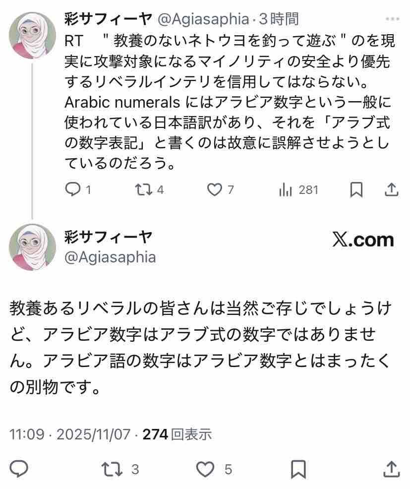 彩サフィーヤ氏の指摘は真っ当だろう。なぜ「敵意」を見出そうとしてるんだ?「自分(が楽しんでるネタ)を指摘する奴は敵!」という発想か?ネトウヨとメンタリティ変わらんな。そら左のネトウヨ言われる訳だ。