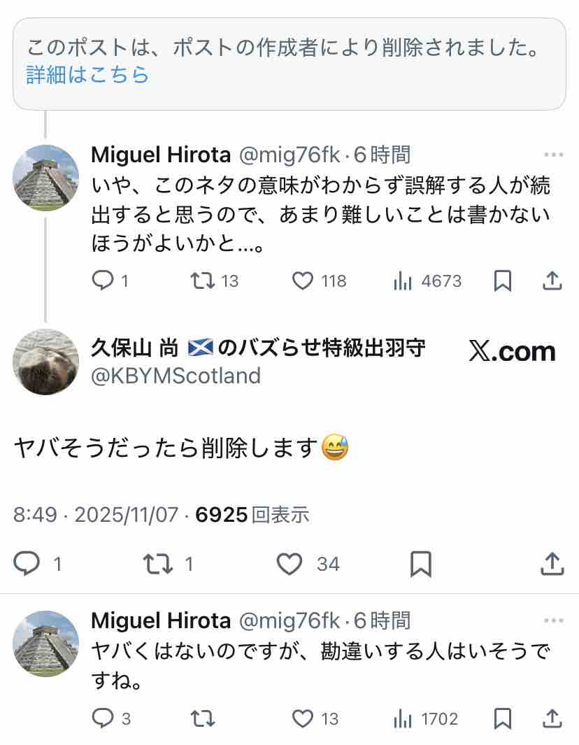 ↑コレどういうことかというと、当初は↓この人が拡散させていたけど、削除しちゃった模様。