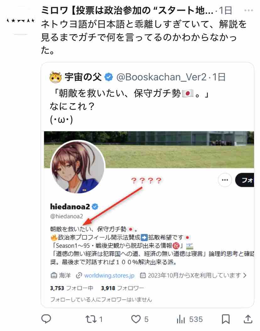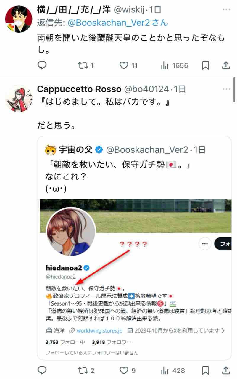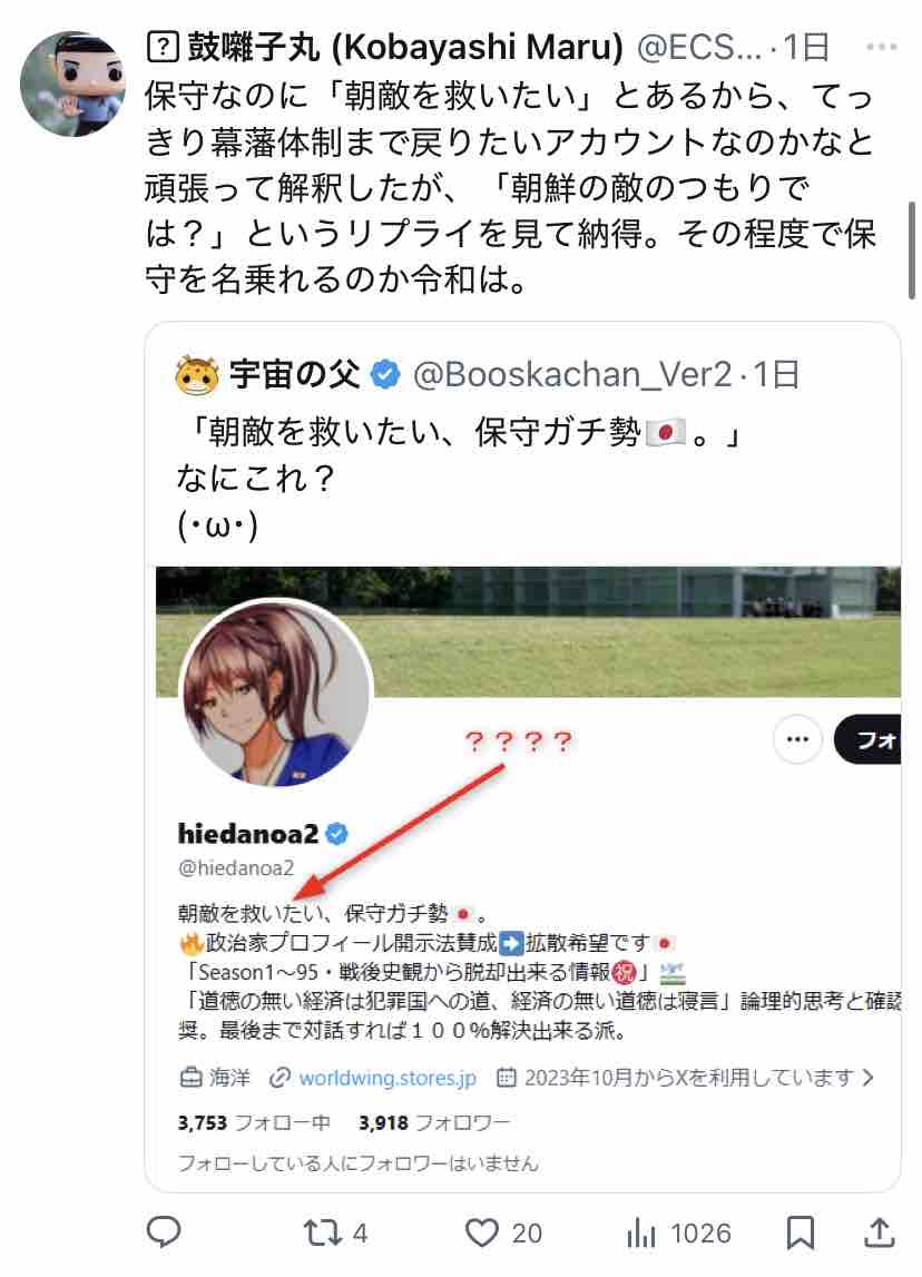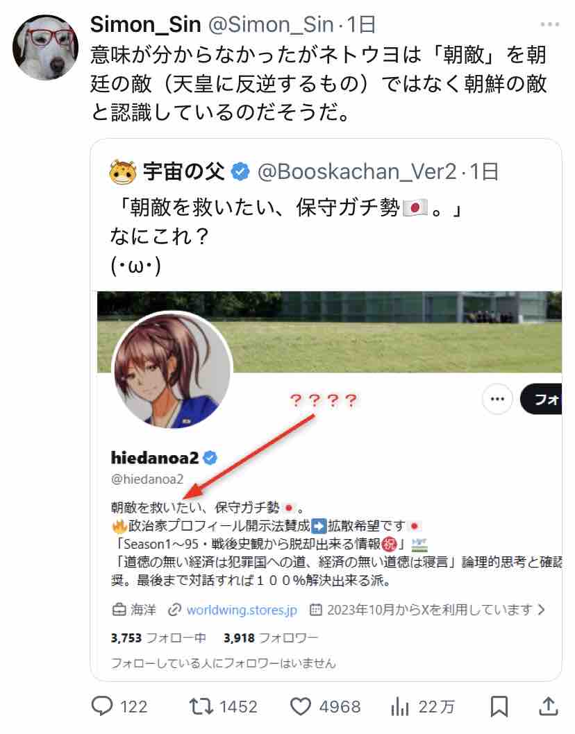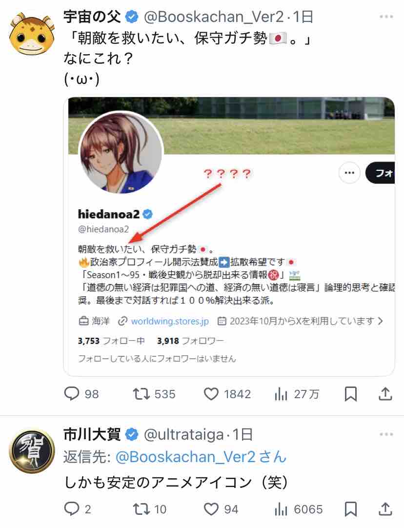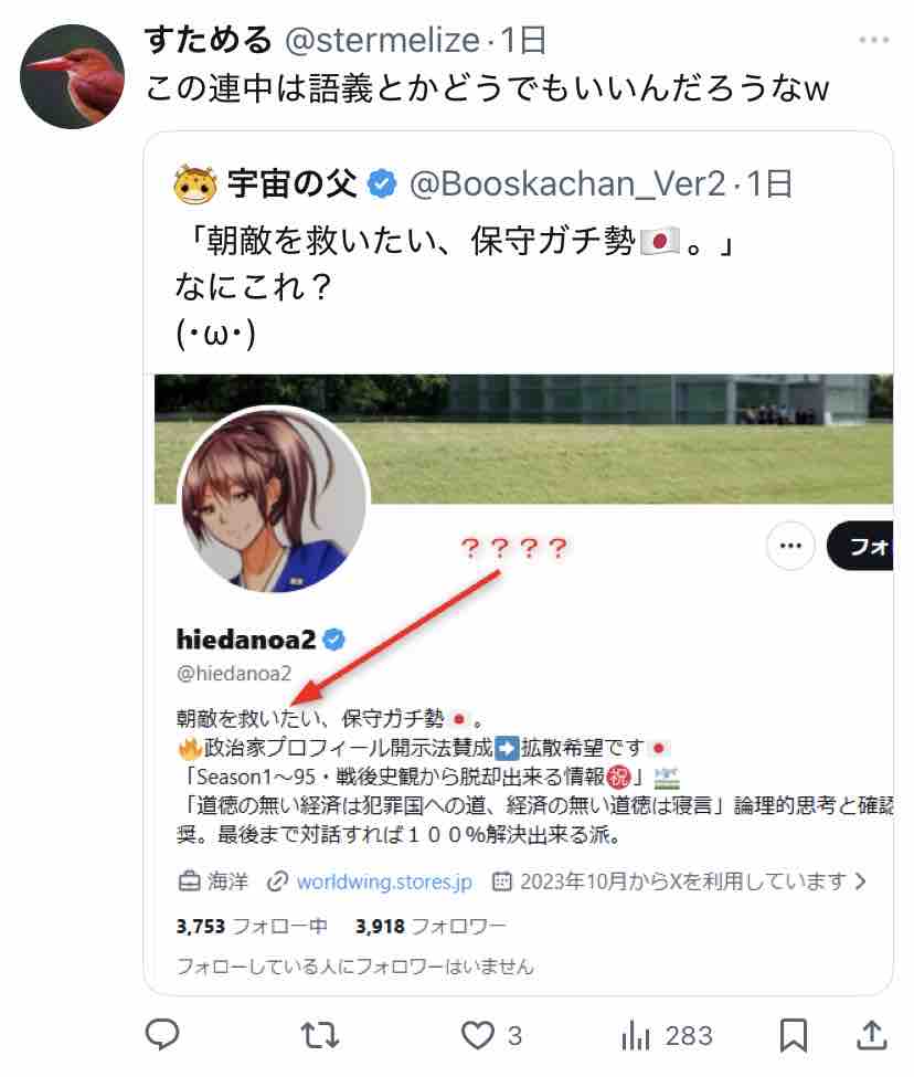 ついでに『朝敵を救いたい、保守ガチ勢🇯🇵』と書いたご本人のプロフィールを見に行ってみましたー。