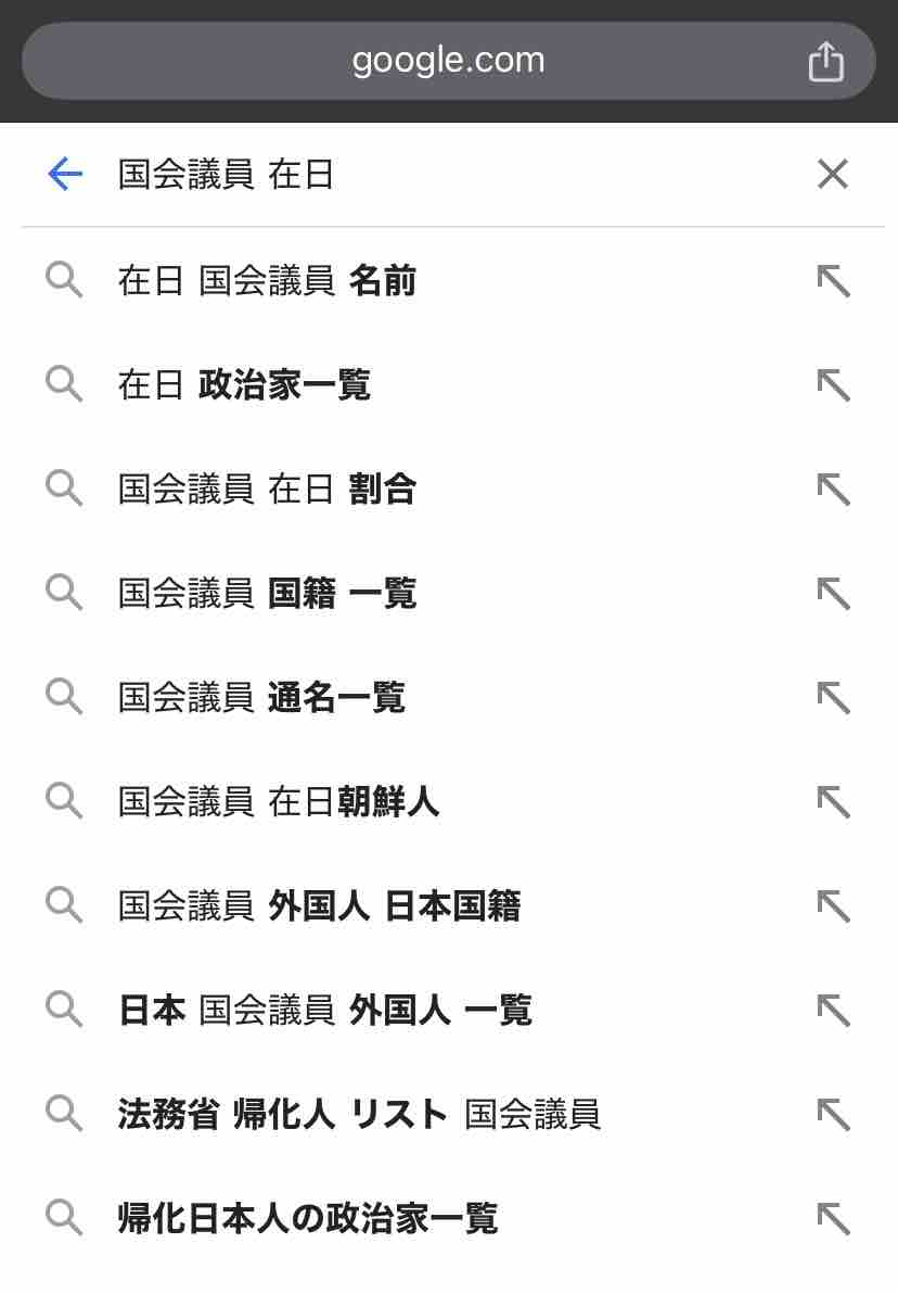 何しろ「国会議員 在日」でググると、サジェストが↓こんなありさまですし。