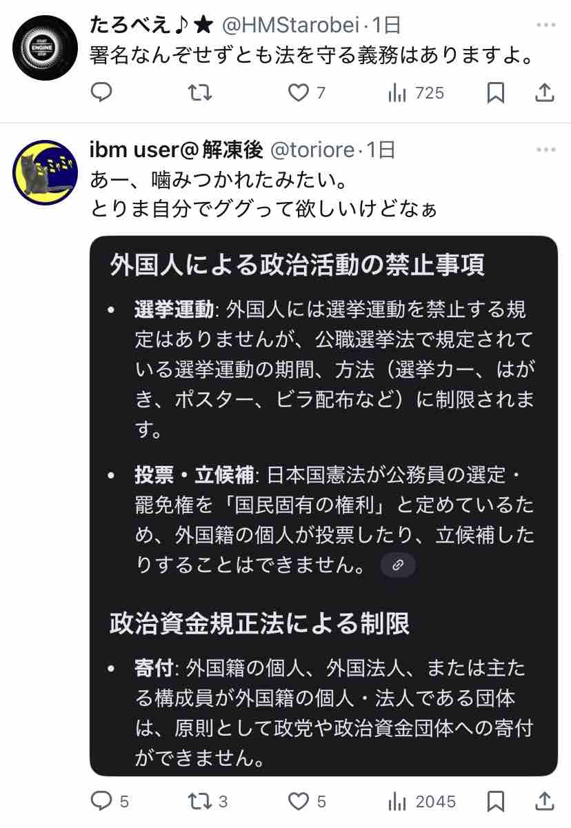 この人の言う『外国人の政治活動は今も違法』って、投票・立候補・寄付のことなん?