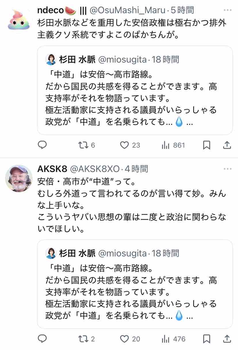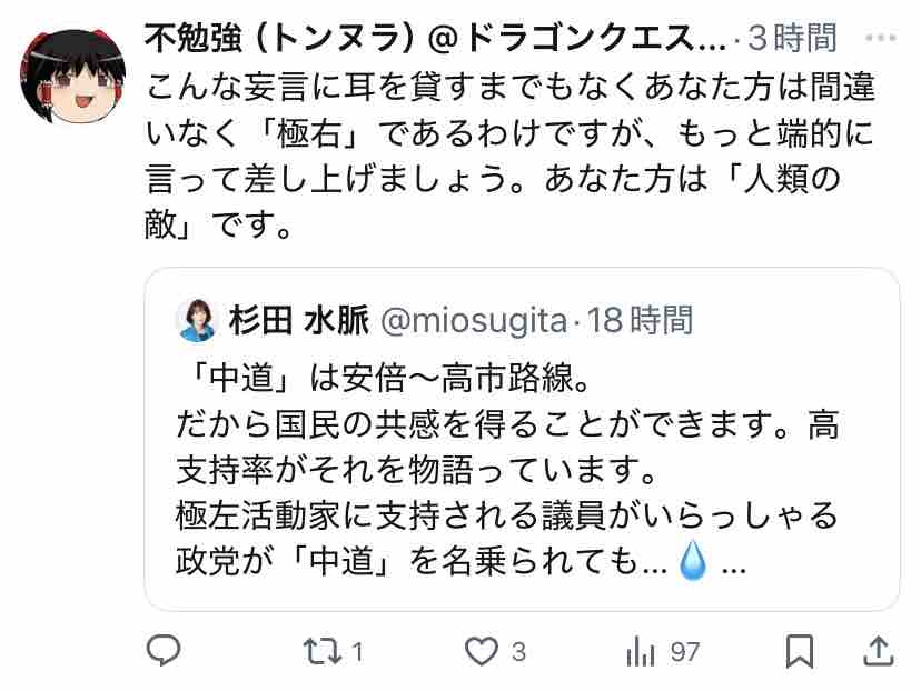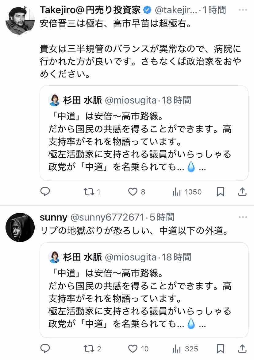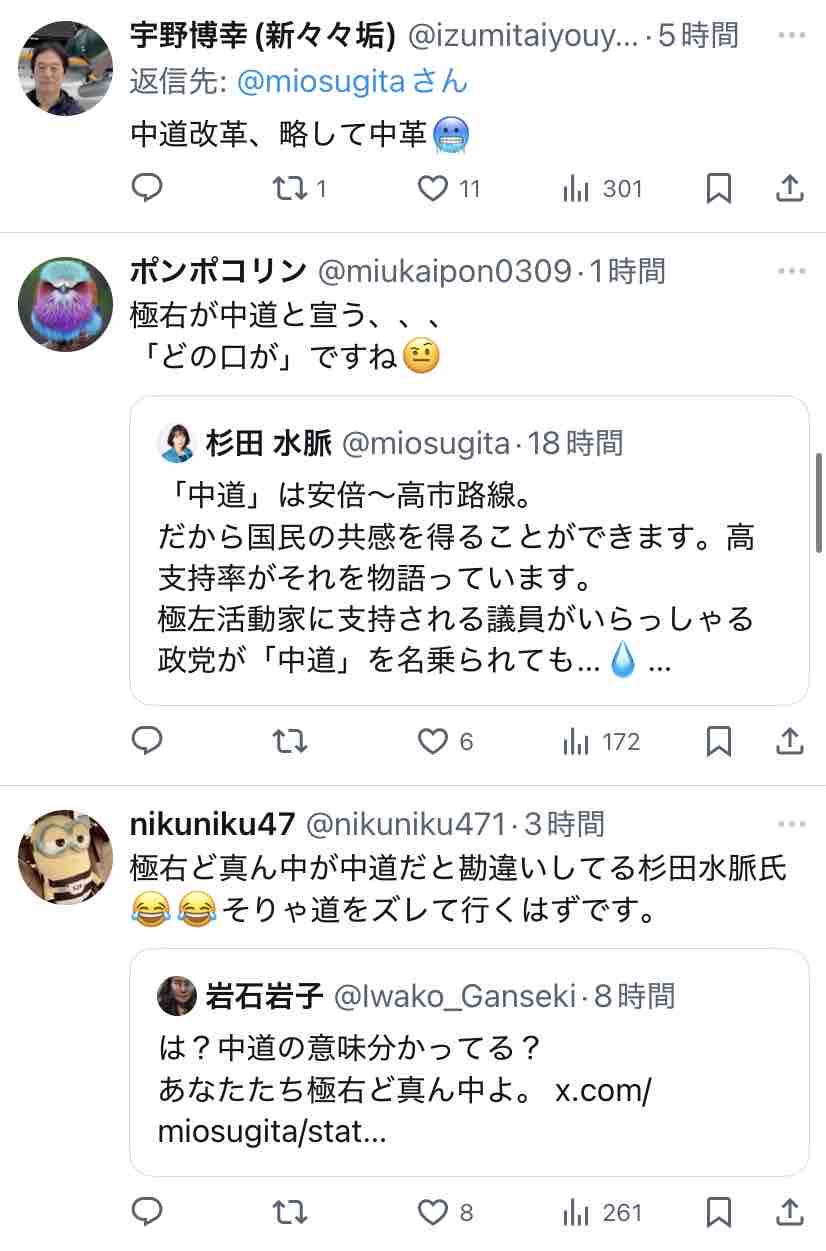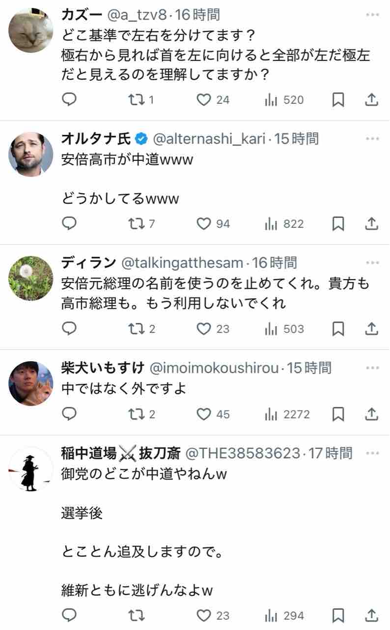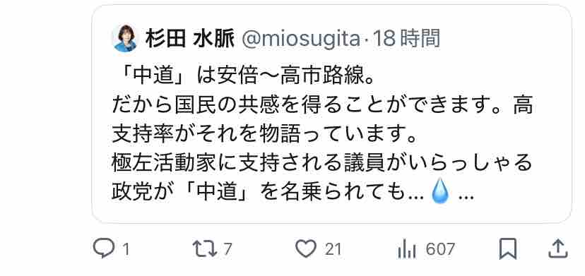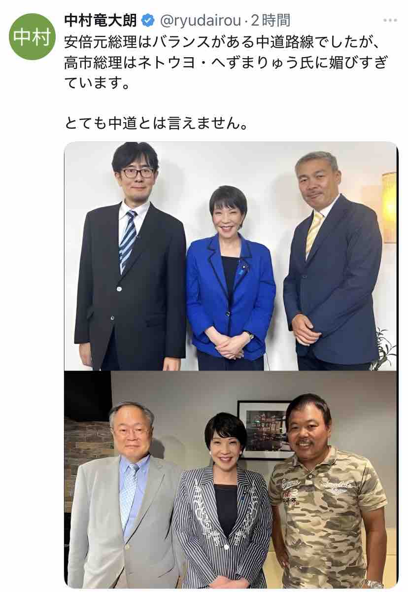 極右活動家である氏が支持する安倍~高市路線は逆説的に中道ではないということになりますな