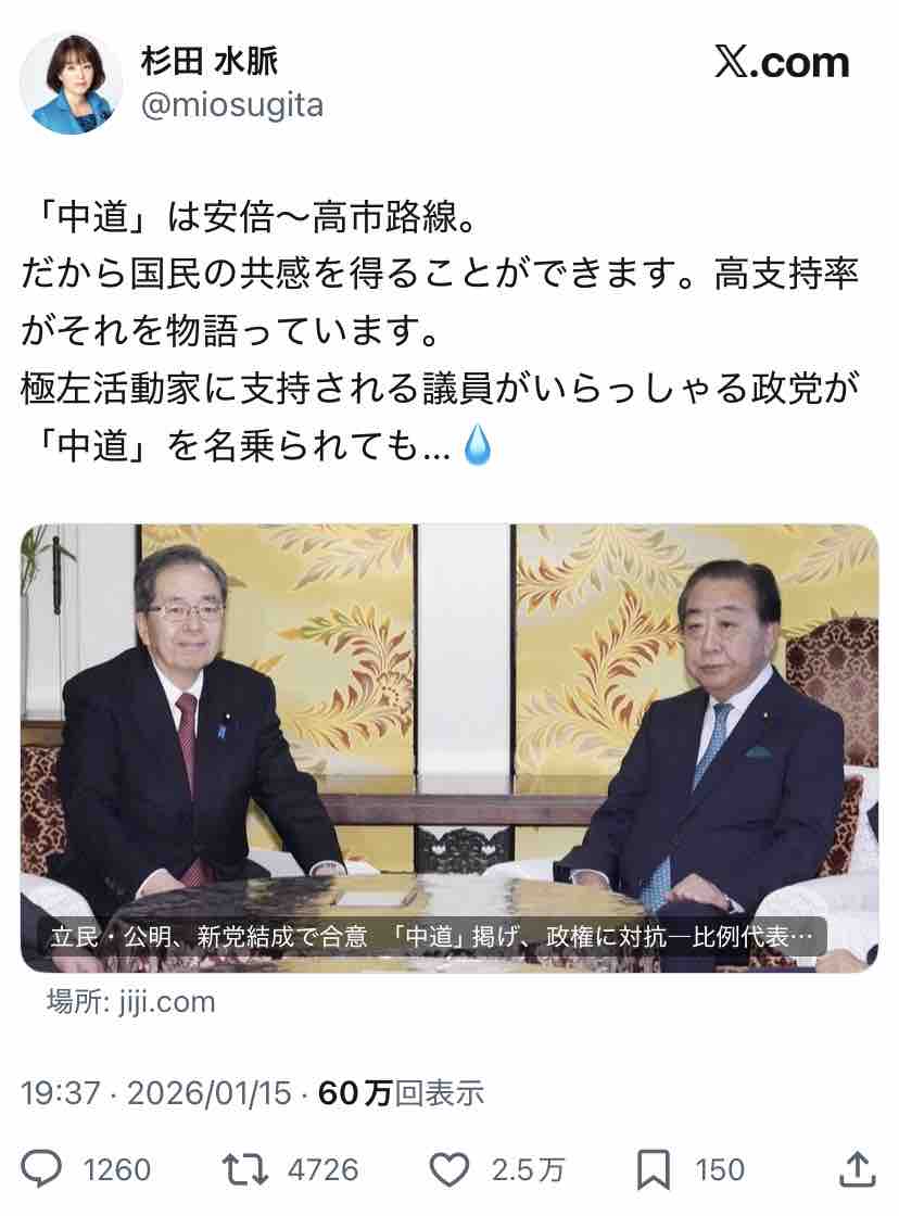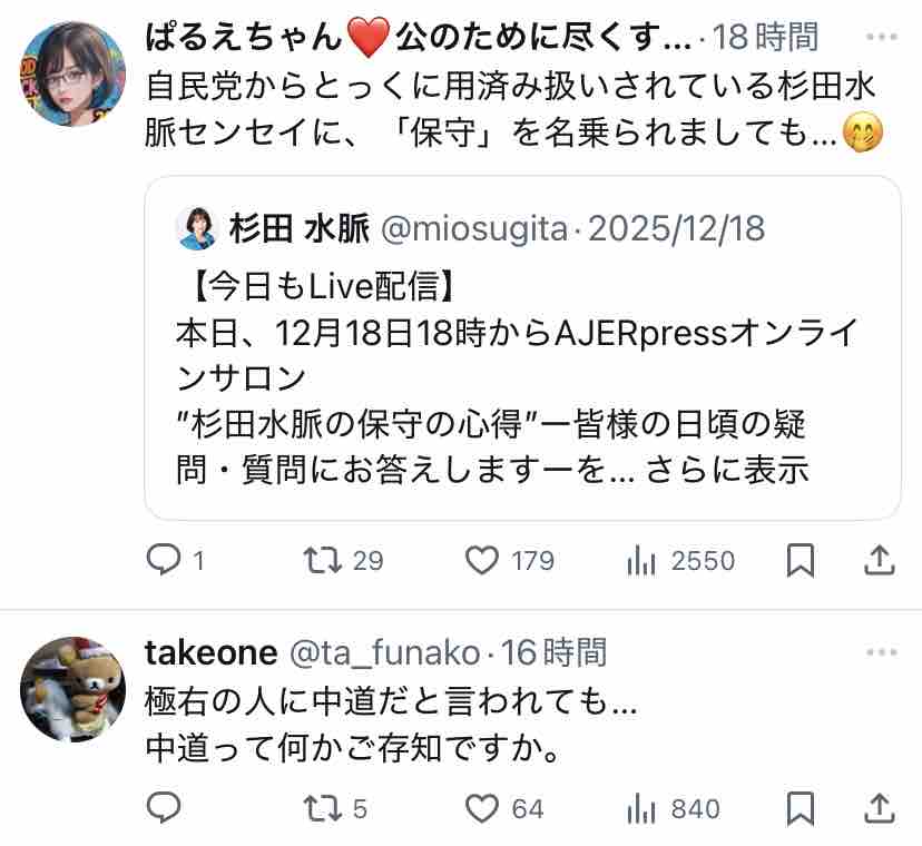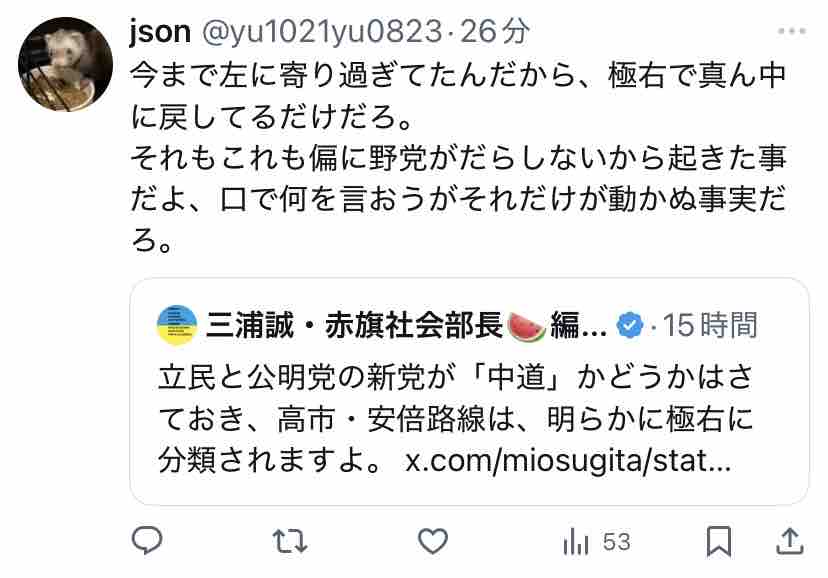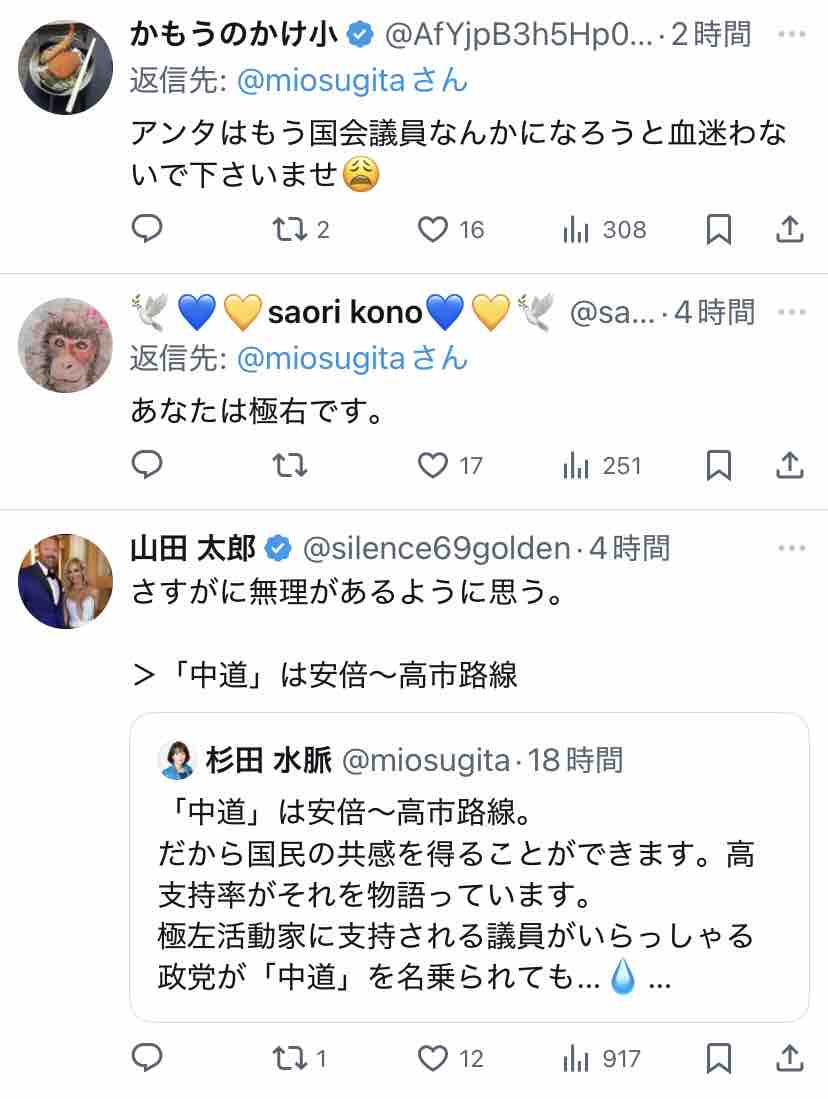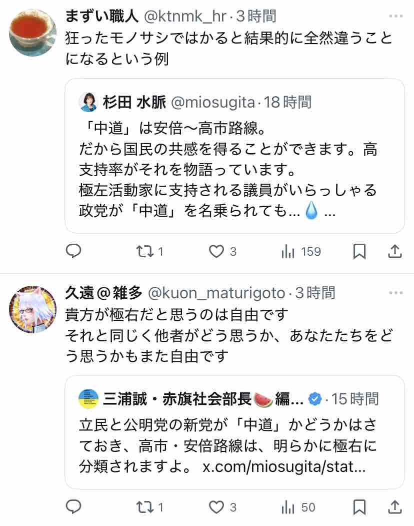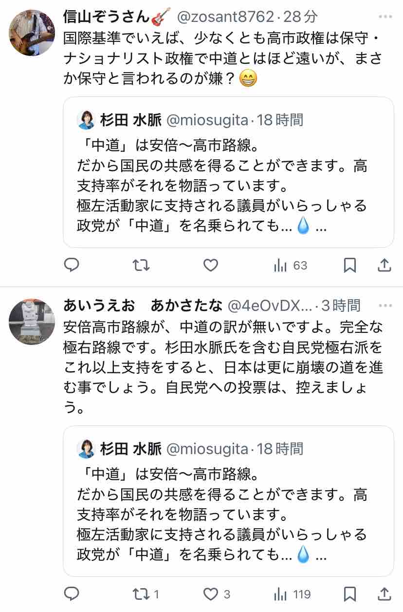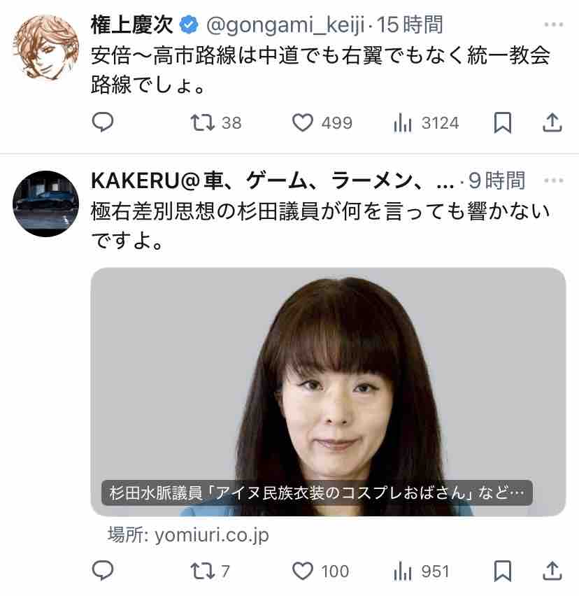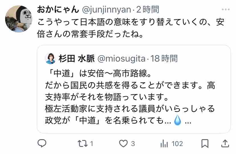 極右活動家である氏が支持する安倍~高市路線は逆説的に中道ではないということになりますな