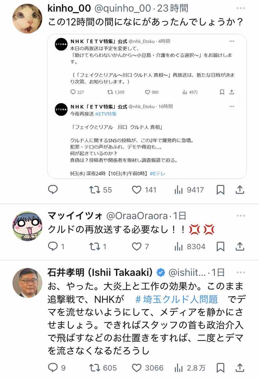 NHKの『ETV特集』「フェイクとリアル〜川口 クルド人 真相〜」再放送が直前に延期に。