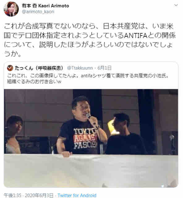 ↑例:「TOKYO AGAINST FASCISM」のTシャツをANTIFAだと言い張る有本香。