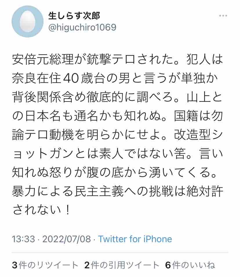 右も左も関係ない。こういうのは絶対ダメだ。死ぬなよ。安倍元首相が撃たれたか、救急搬送 奈良の駅前で演説中 (朝日新聞デジタル - 07月08日 11:56)設定