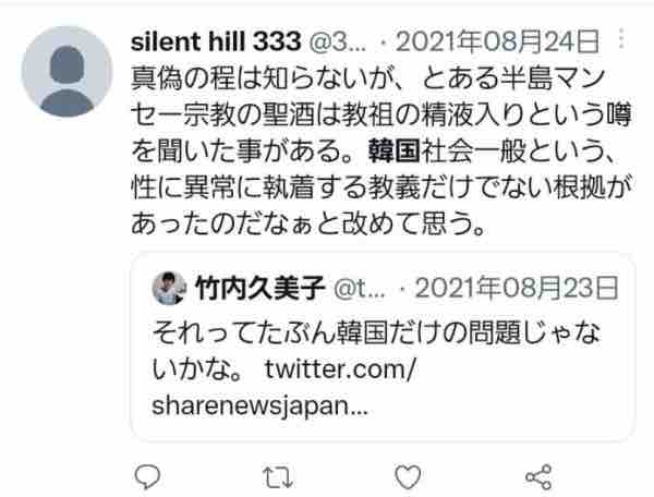 真偽の程は知らないが、とある半島マンセー宗教の聖酒は教祖の精液入りという噂を聞いた事がある。韓国社会一般という、性に異常に執着する教義だけでない根拠があったのだなぁと改めて思う。