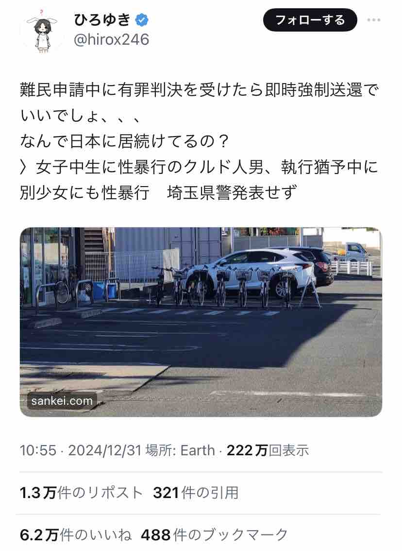 『<独自>女子中生に性暴行のクルド人男、執行猶予中に別少女にも性暴行 埼玉県警発表せず』
