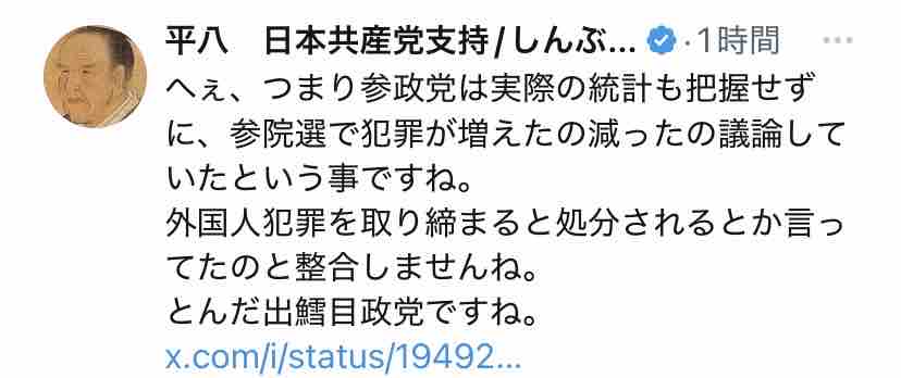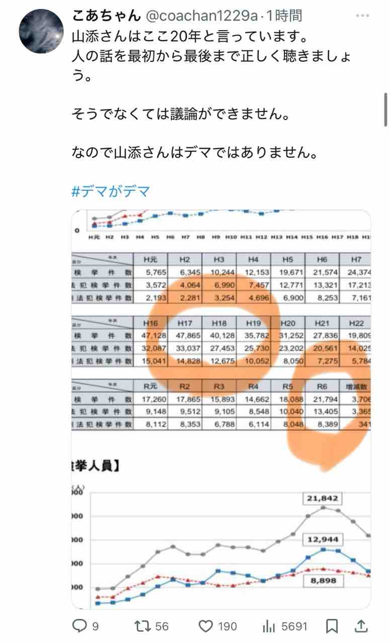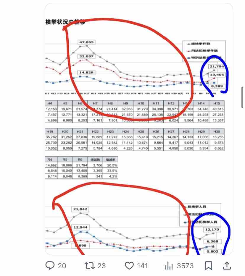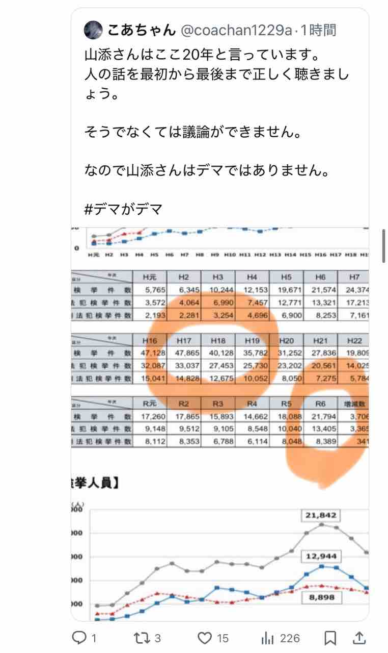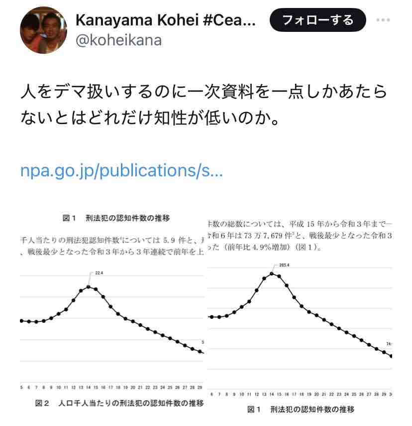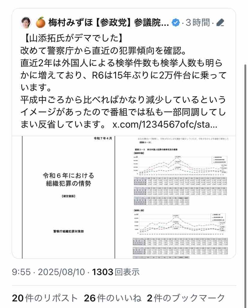 ↑えっ、外国人犯罪はここ20年で1/3になってるのに、直近2年で微増しただけで『山添拓氏がデマ』ですか?
