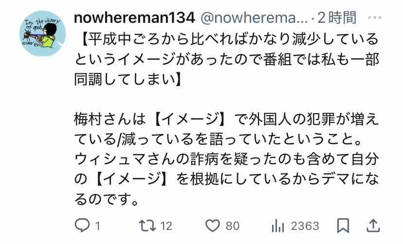 『朝まで生テレビ!』で外国人犯罪の増加デマについて共産党の山添拓にフルボッコにされ、「民意を得たのはどっち?」という論点ずらししか出来なかったことが記憶に新しいところ。